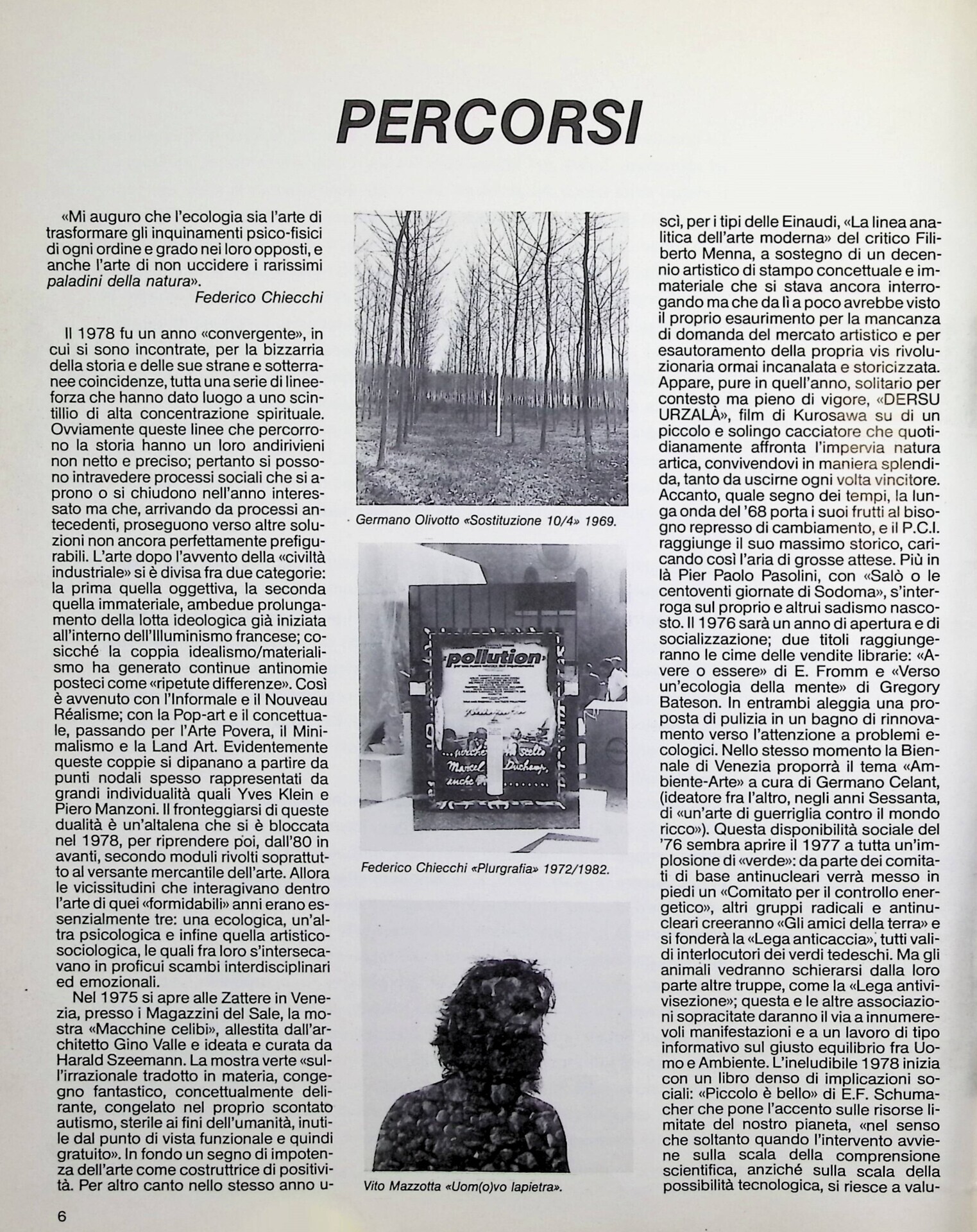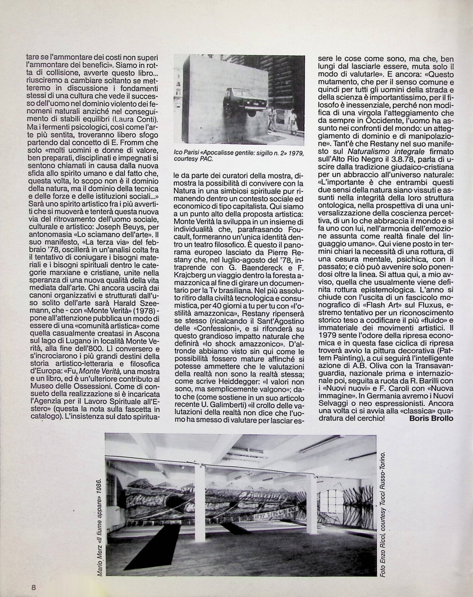 | Descrizione | Articolo dedicato al rapporto tra arte e natura e focalizzato sul viaggio nella foresta amazzonica di Pierre Restany, da cui nasce il manifesto Naturalismo Integrale, firmato sull’Alto Rio ne*ro nel 1978. |