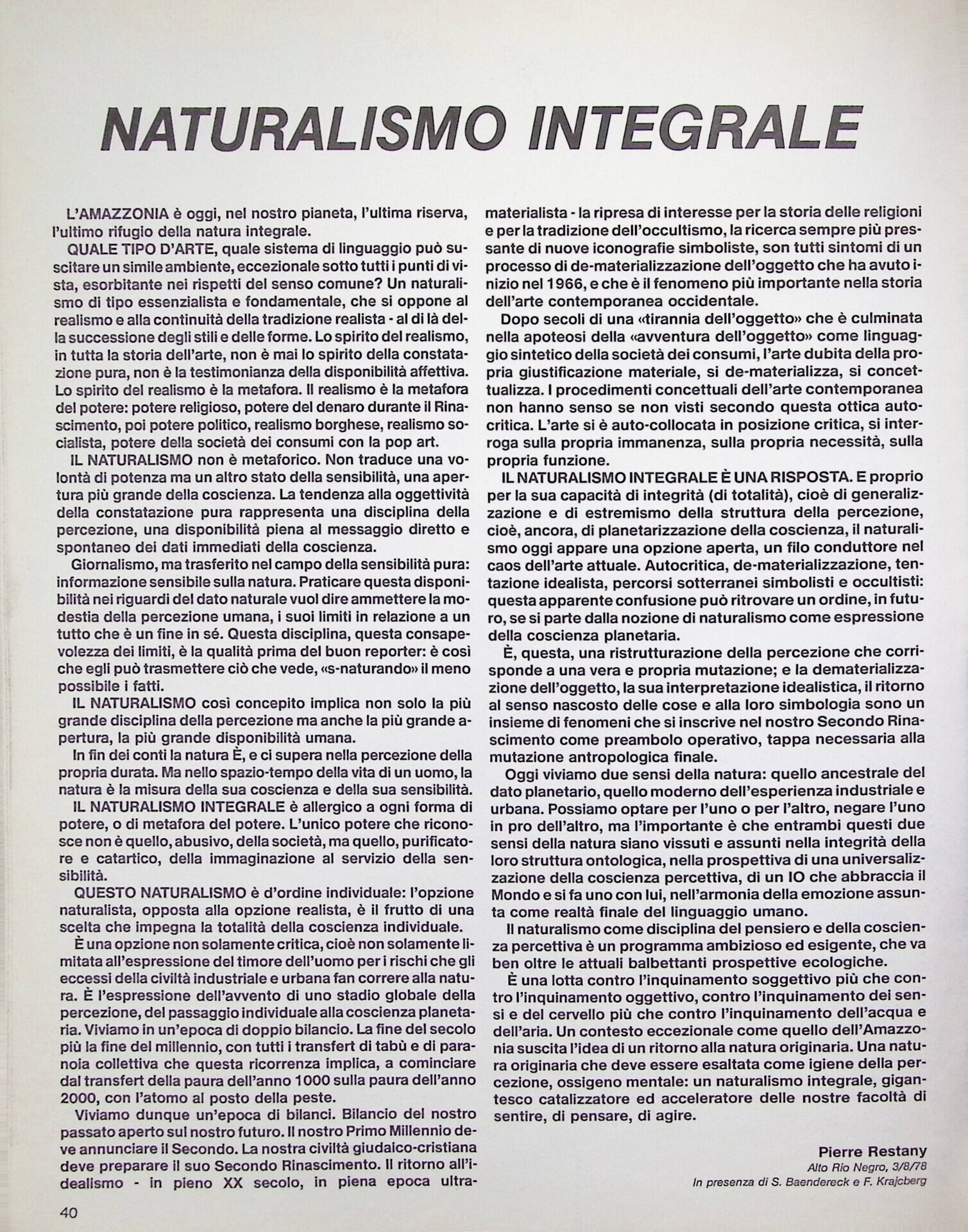Riflessione di Pierre Restany sul concetto di "naturalismo" in opposizione al "realismo": nel testo l'Amazzonia è definita come "ultimo rifugio della natura integrale".