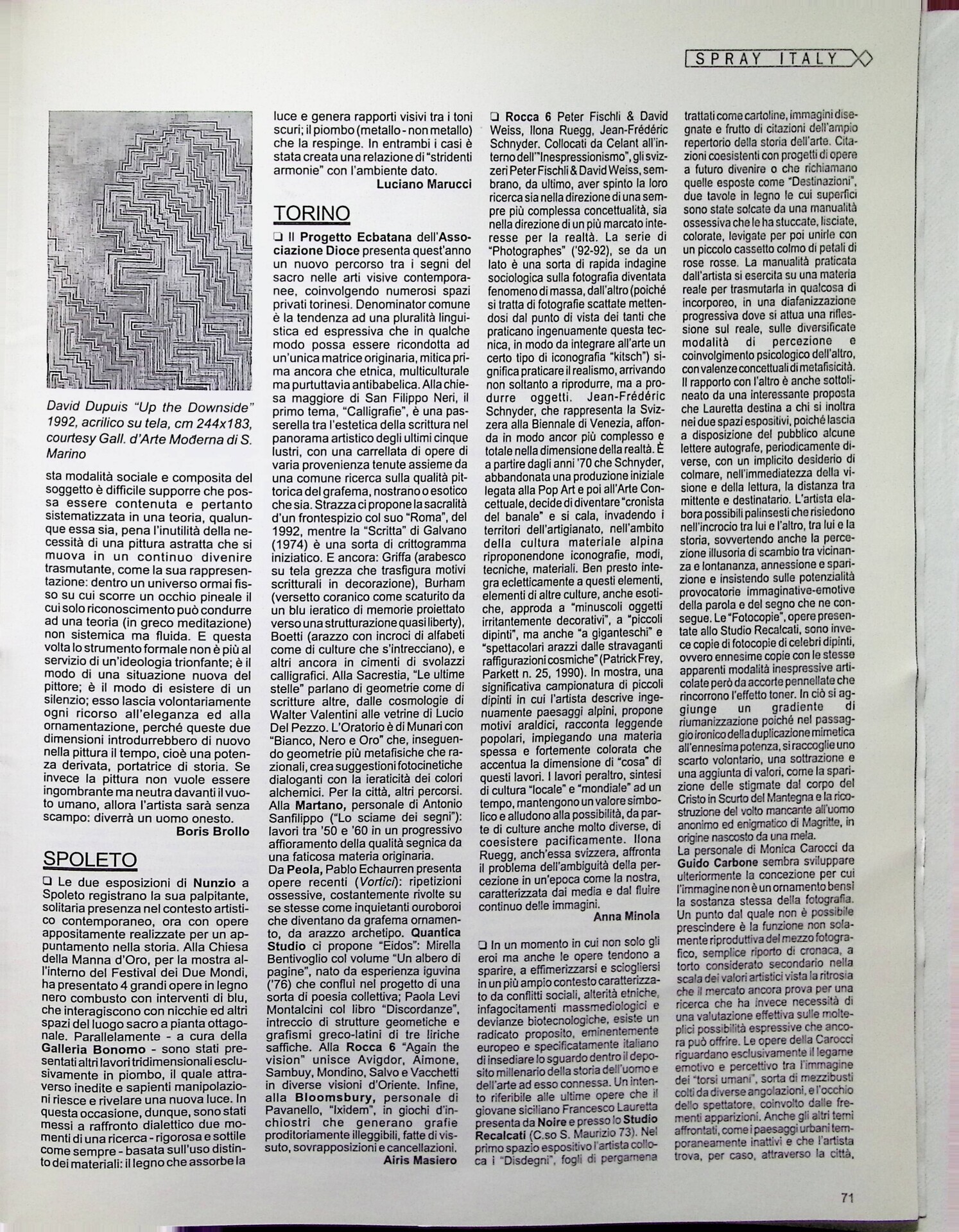 | Descrizione | Segnalazione della mostra di Jean Frédéric Schnyder a Torino, dove un’iconografia del "banale" si intreccia con elementi di "altre culture, anche esotiche". I lavori rappresentano una "sintesi di cultura 'locale' e 'mondiale'", suggerendo la possibilità di una pacifica convivenza tra culture diverse. |