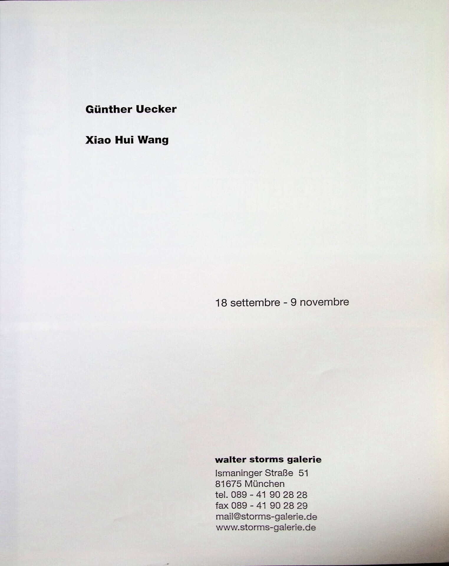 Pubblicità di una mostra alla Walter Storms Galerie di Monaco con la partecipazione dell'artista Xiao Hui Wang [cinese].