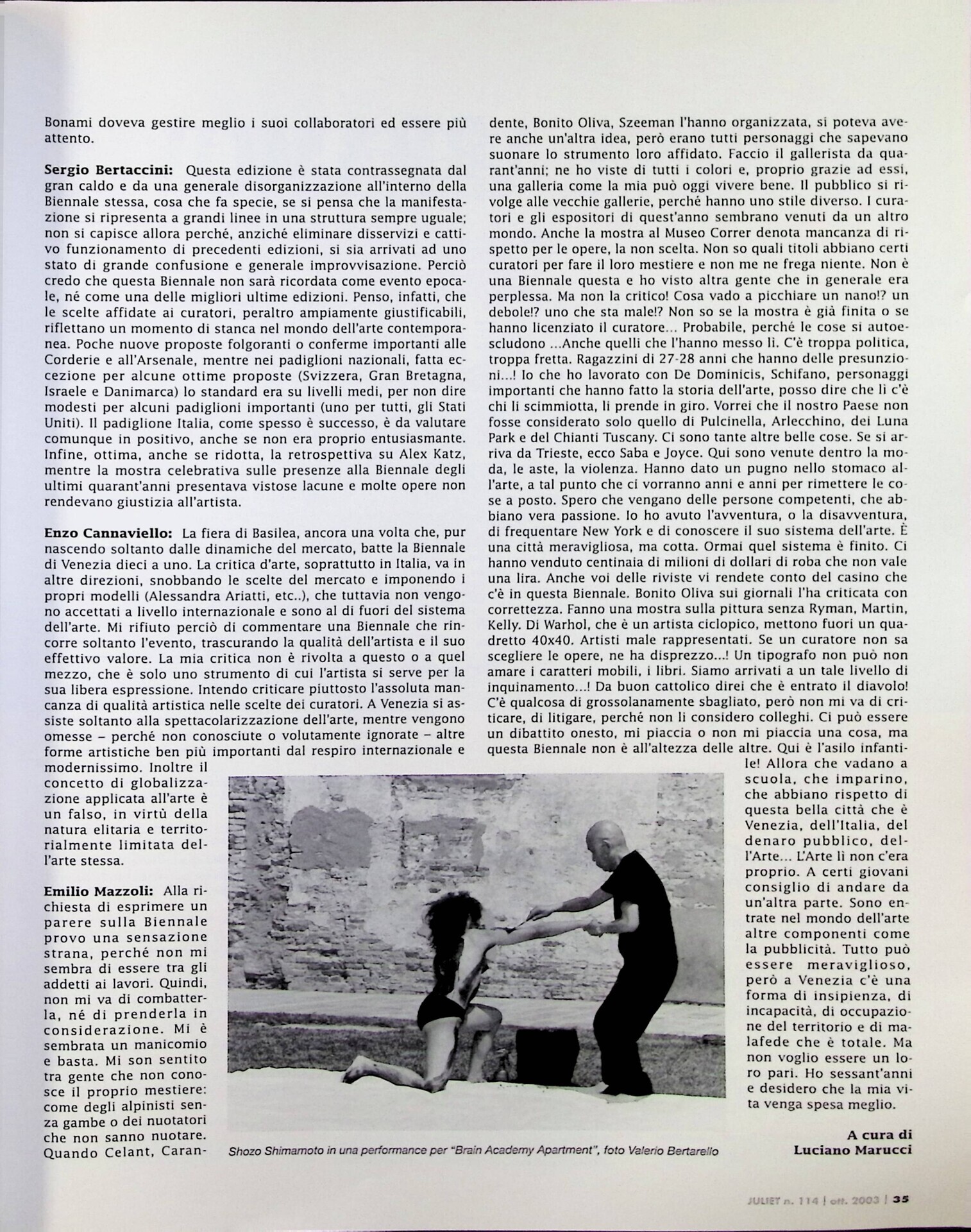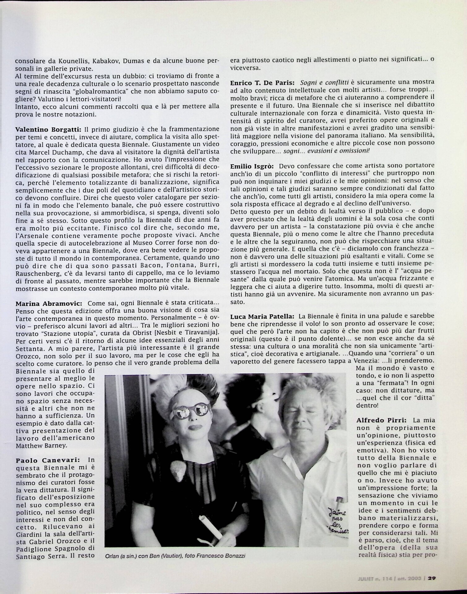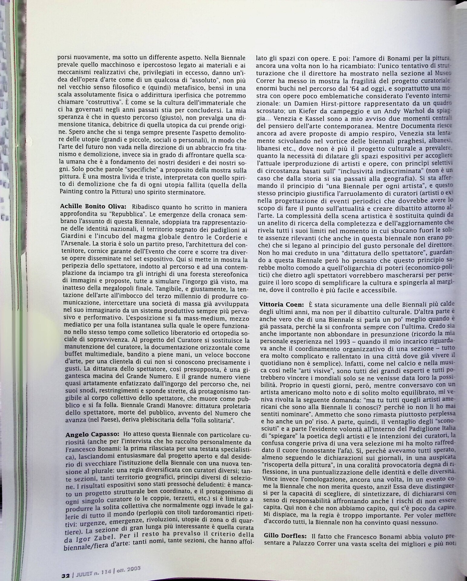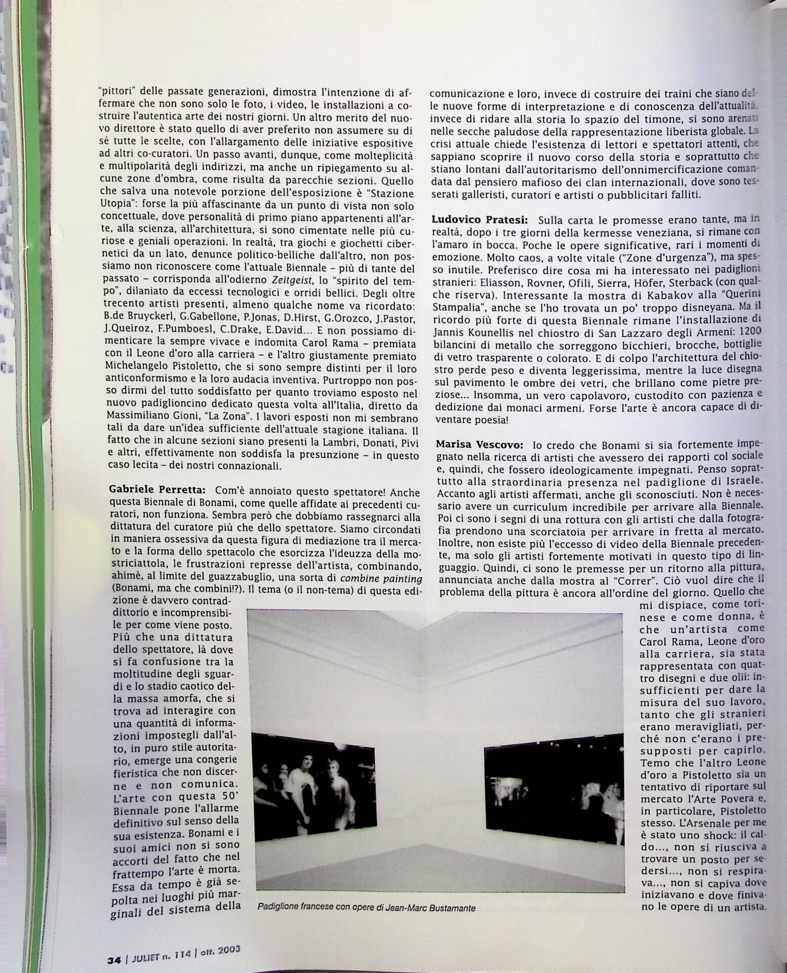 Luciano Marucci, Una Biennale...a caldo, «Juliet», n. 114, ottobre-novembre 2003, pp. 28-35