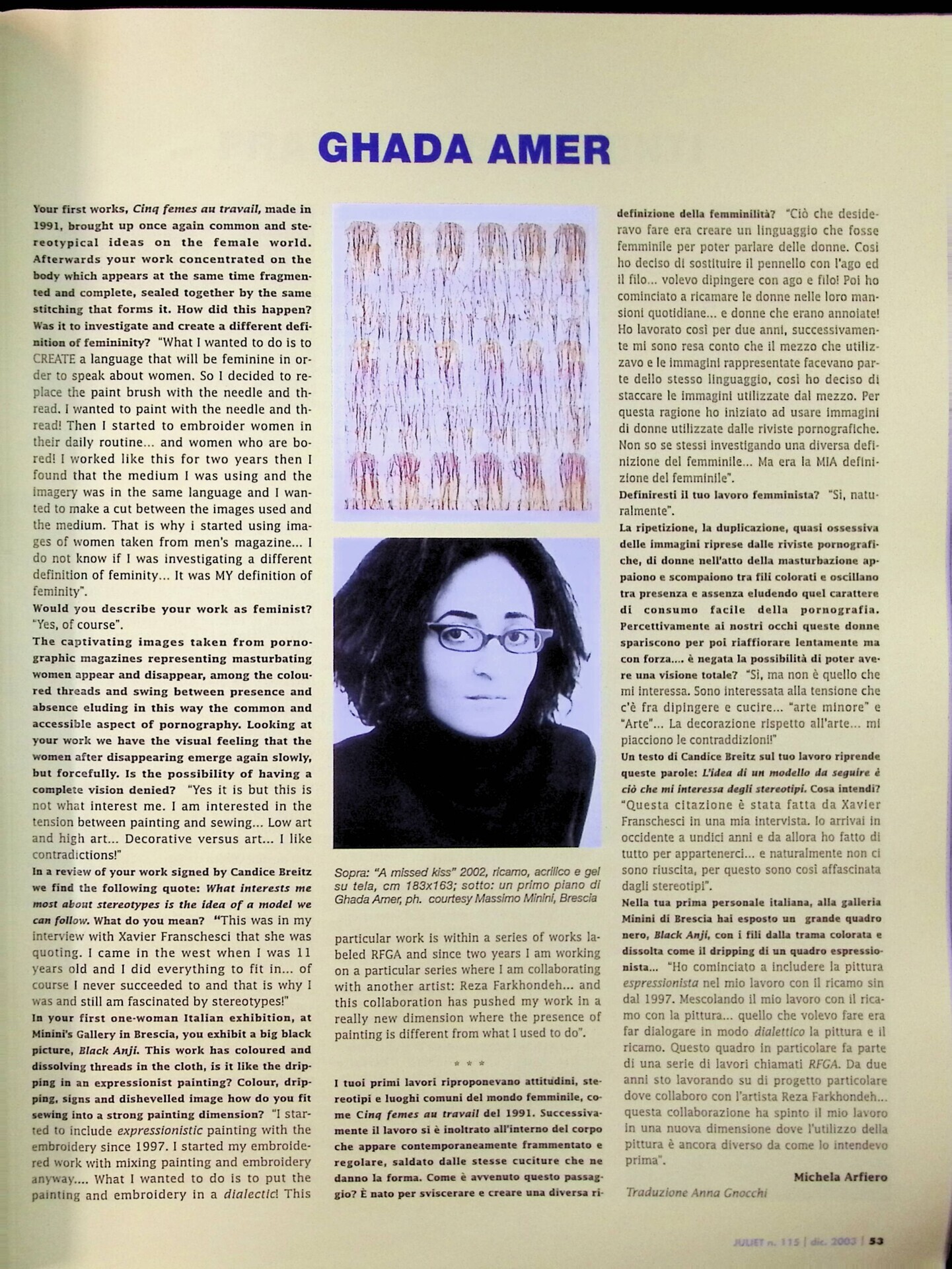Michela Arfiero, Ghada Amer, «Juliet», n. 115, dicembre 2003 - gennaio 2004, p. 53