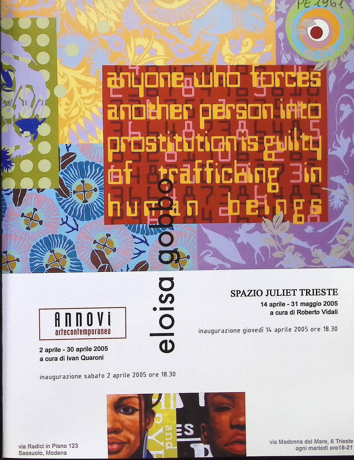 | Descrizione | Pubblicità della mostra di Eloisa Gobbo allo Spazio Juliet di Trieste, con un’opera che ritrae il volto di due persone afrodiscendenti. |