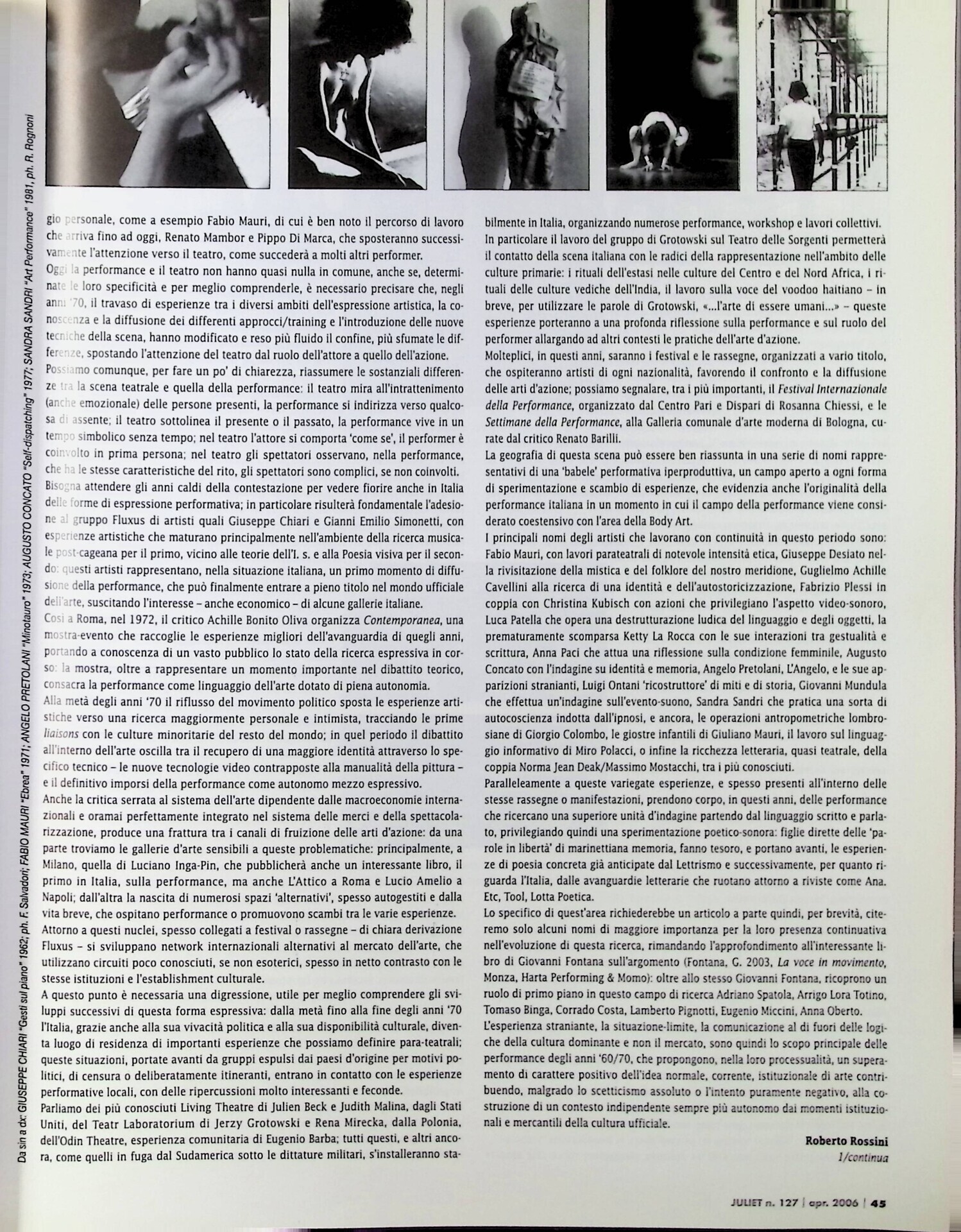 Roberto Rossini, Percorso della performance in Italia, «Juliet», n. 127, aprile-maggio 2006, pp. 44-45