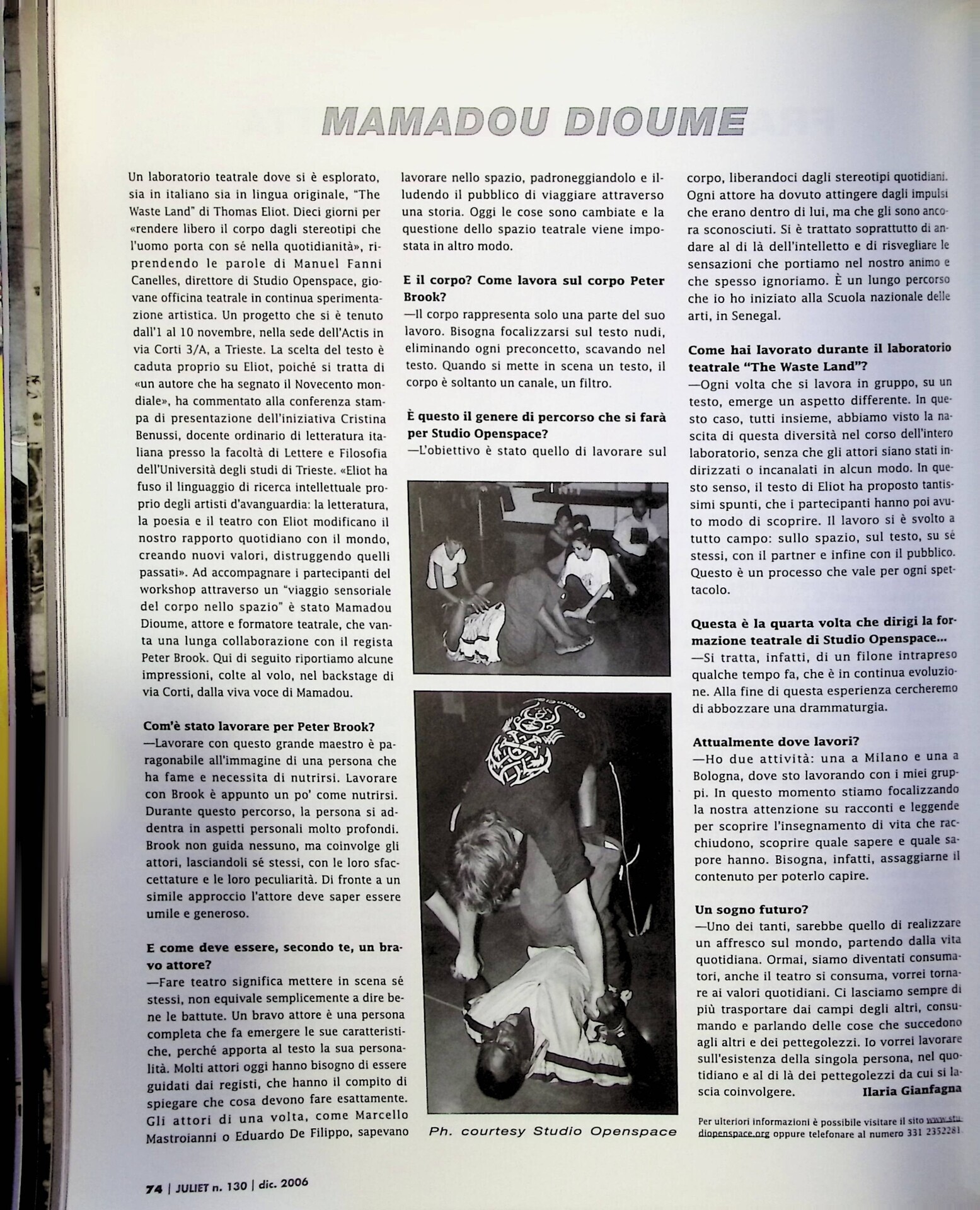 Ilaria Gianfagna, Mamadou Dioume, «Juliet», n. 130, dicembre 2006 - gennaio 2007, p. 74