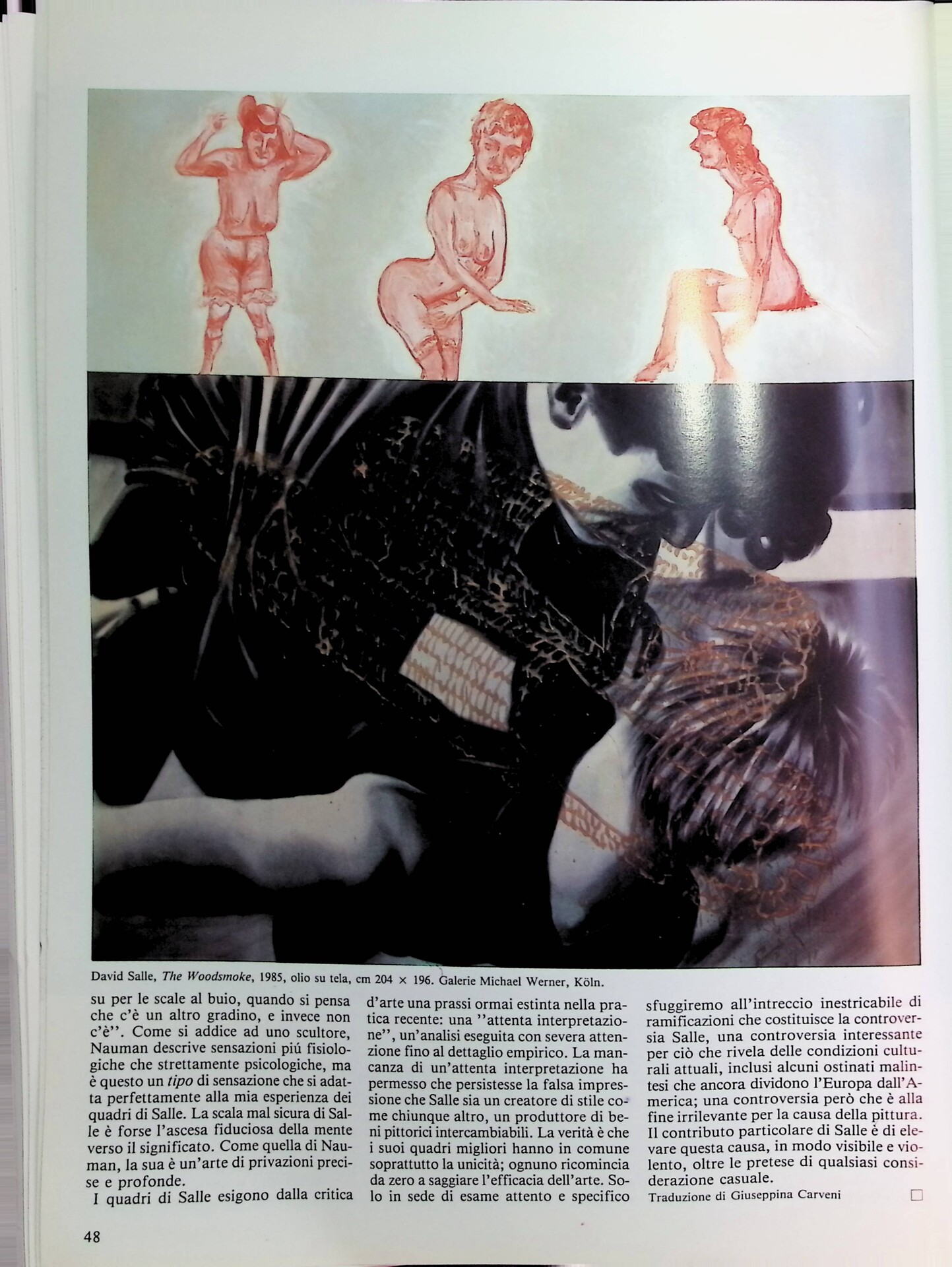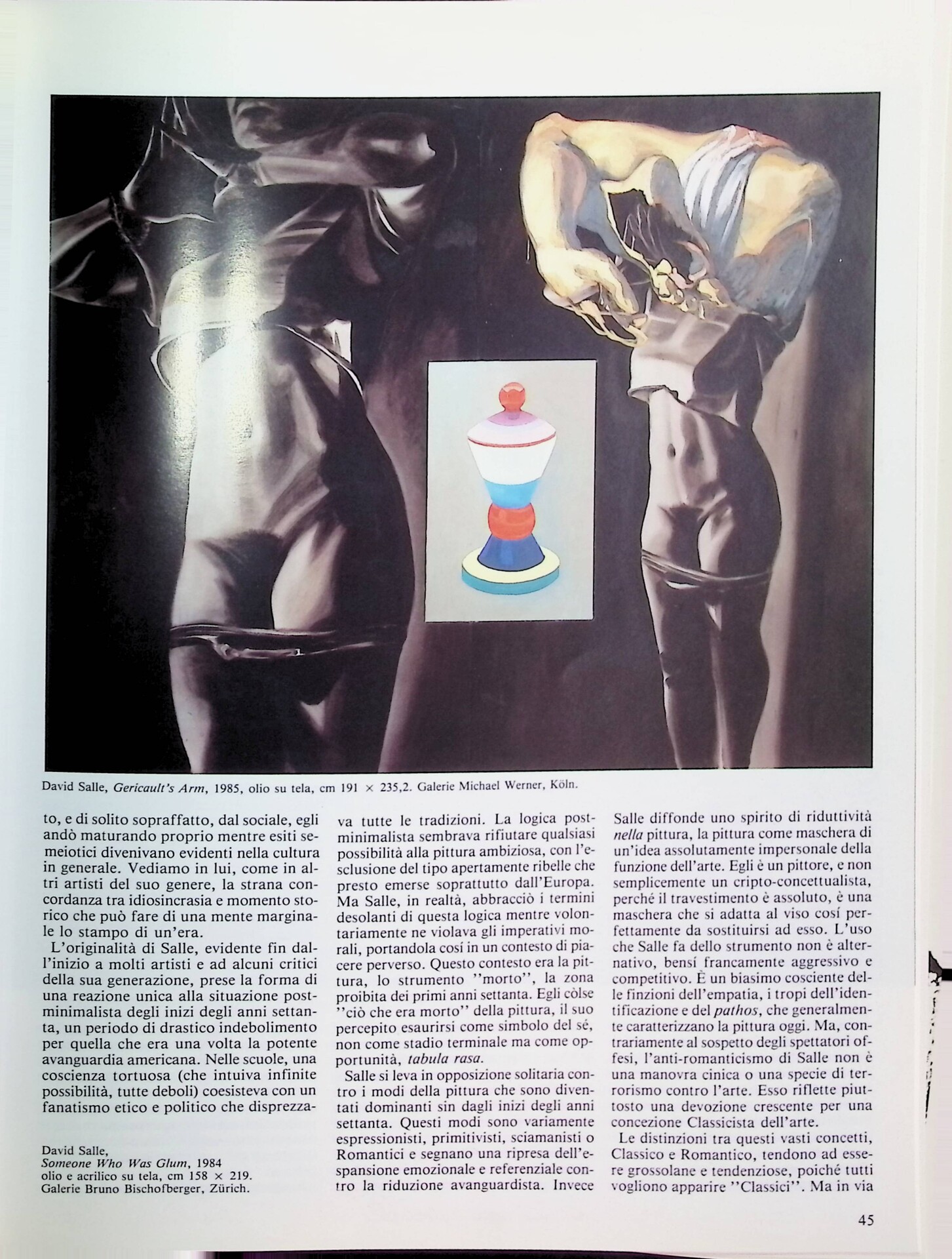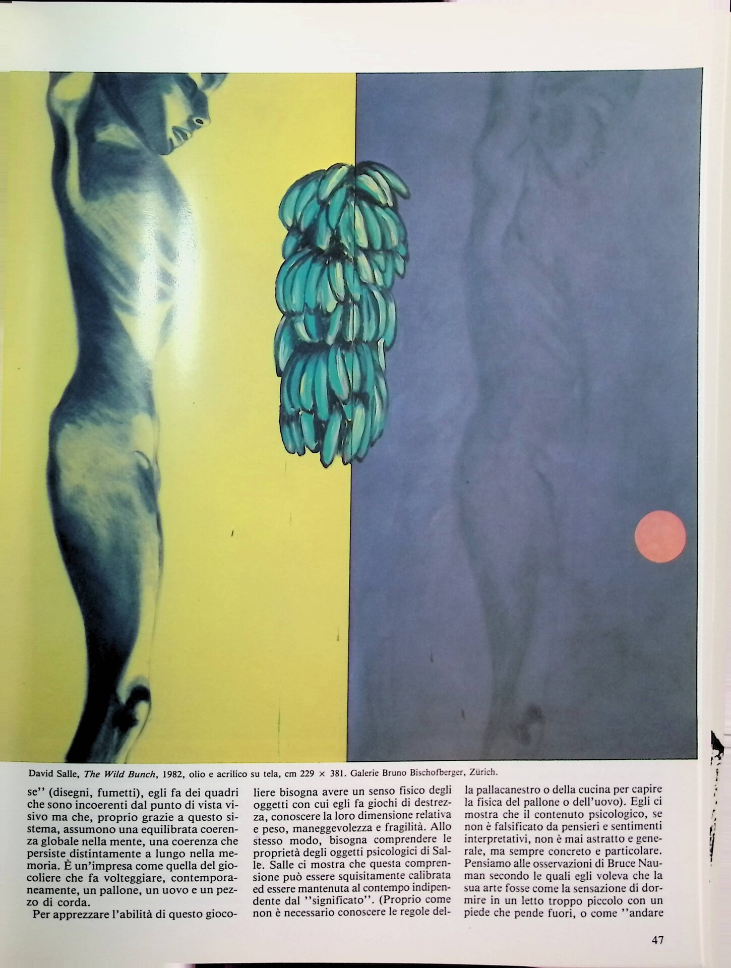 | Descrizione | L'articolo è dedicato a David Salle, evidenziando la sua differenza di stile rispetto a tendenze convenzionali come "primitivisti" e "sciamanisti". Tuttavia, l’opera The Wild Bunch (1982) richiama una figurazione primitivista, associando il corpo maschile a un casco di banane. |