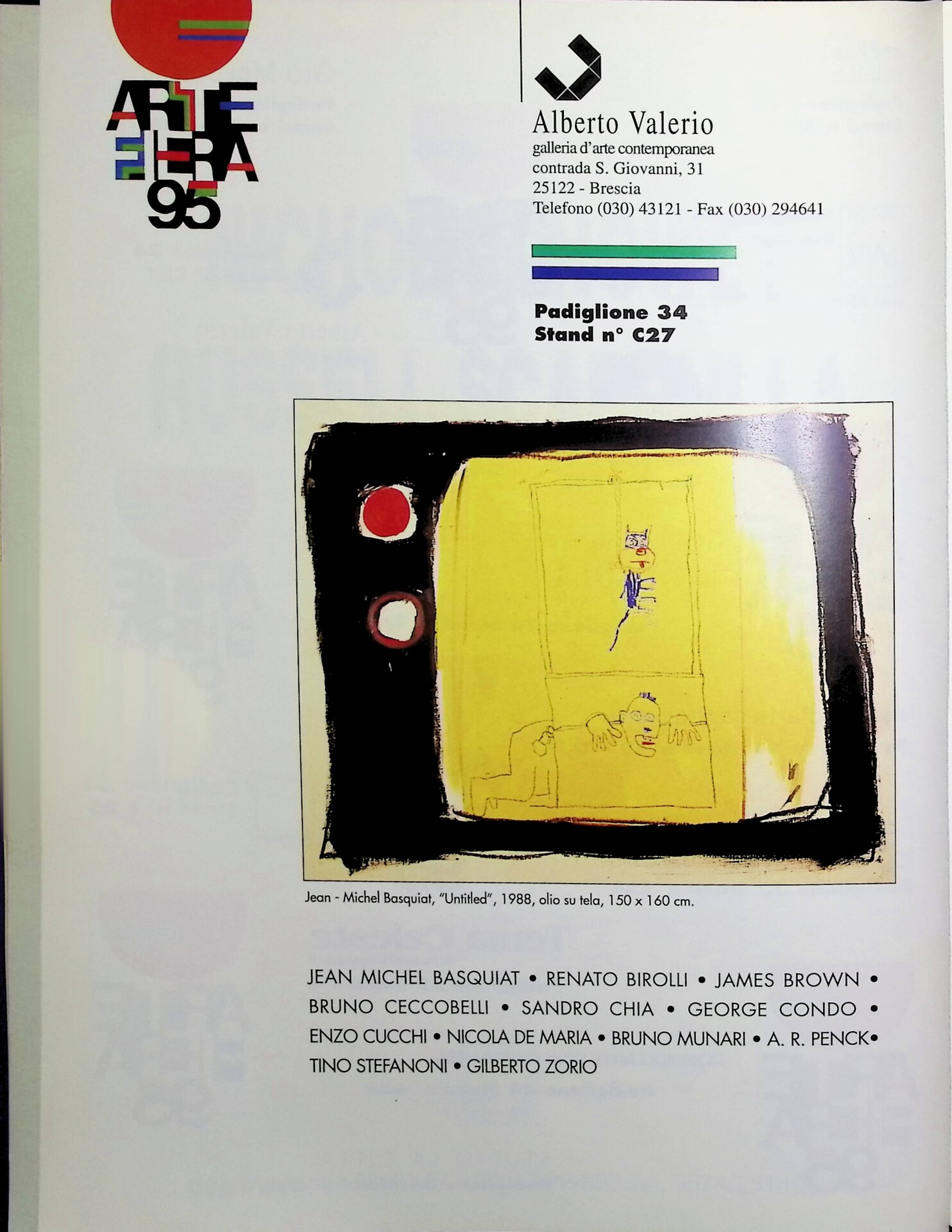 Pubblicità della galleria d'arte contemporanea Alberto Valerio in occasione della rassegna Arte Fiera 95, con la riproduzione dell'opera Untitled (1988) di Jean-Michel Basquiat.