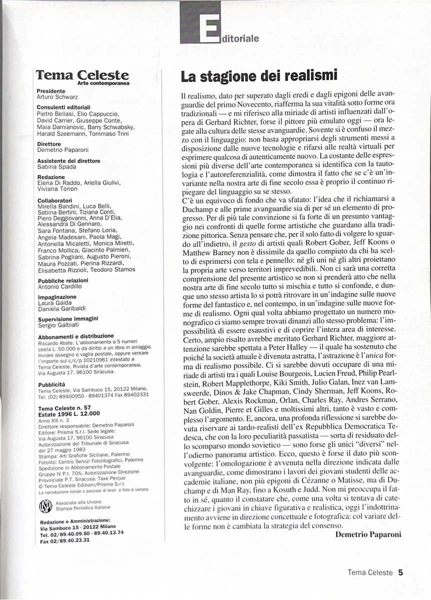 Demetrio Paparoni, La stagione dei realismi, «Tema Celeste», n. 57, estate 1996, p. 5
