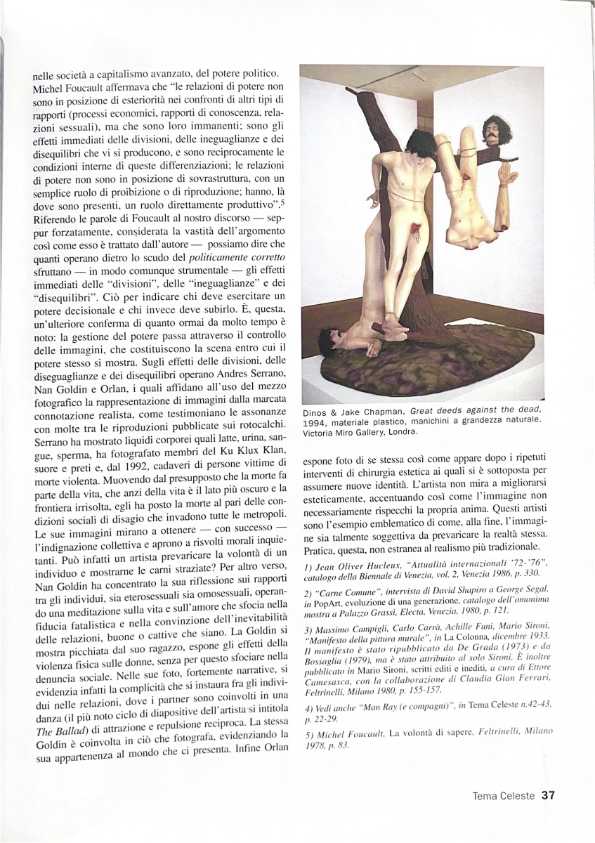 | Descrizione | Articolo sul realismo artistico e le sue implicazioni sociopolitiche, in cui si citano, tra gli altri, Andres Serrano [origini honduregne e afro-cubane] e un'opera di Nan Goldin raffigurante un uomo giapponese in chiave erotica. |