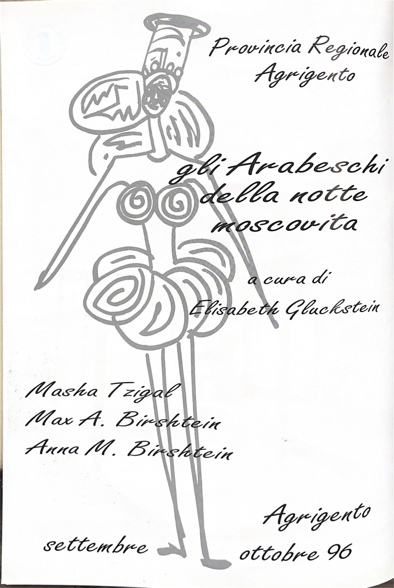 | Descrizione | Pubblicità della mostra Gli arabeschi della notte moscovita ad Agrigento, con la presenza di Masha Tzigal, Max Advadevitch Birshtein e Anna Maxovna Birshtein [russi]. |