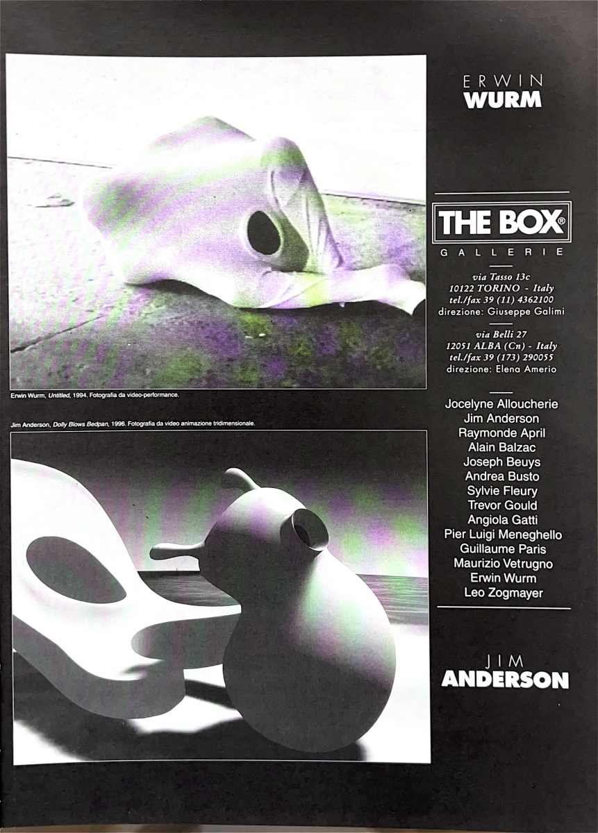 | Descrizione | Pubblicità della galleria The Box di Torino, tra gli artisti presenti Trevor Gould [sudafricano]. |