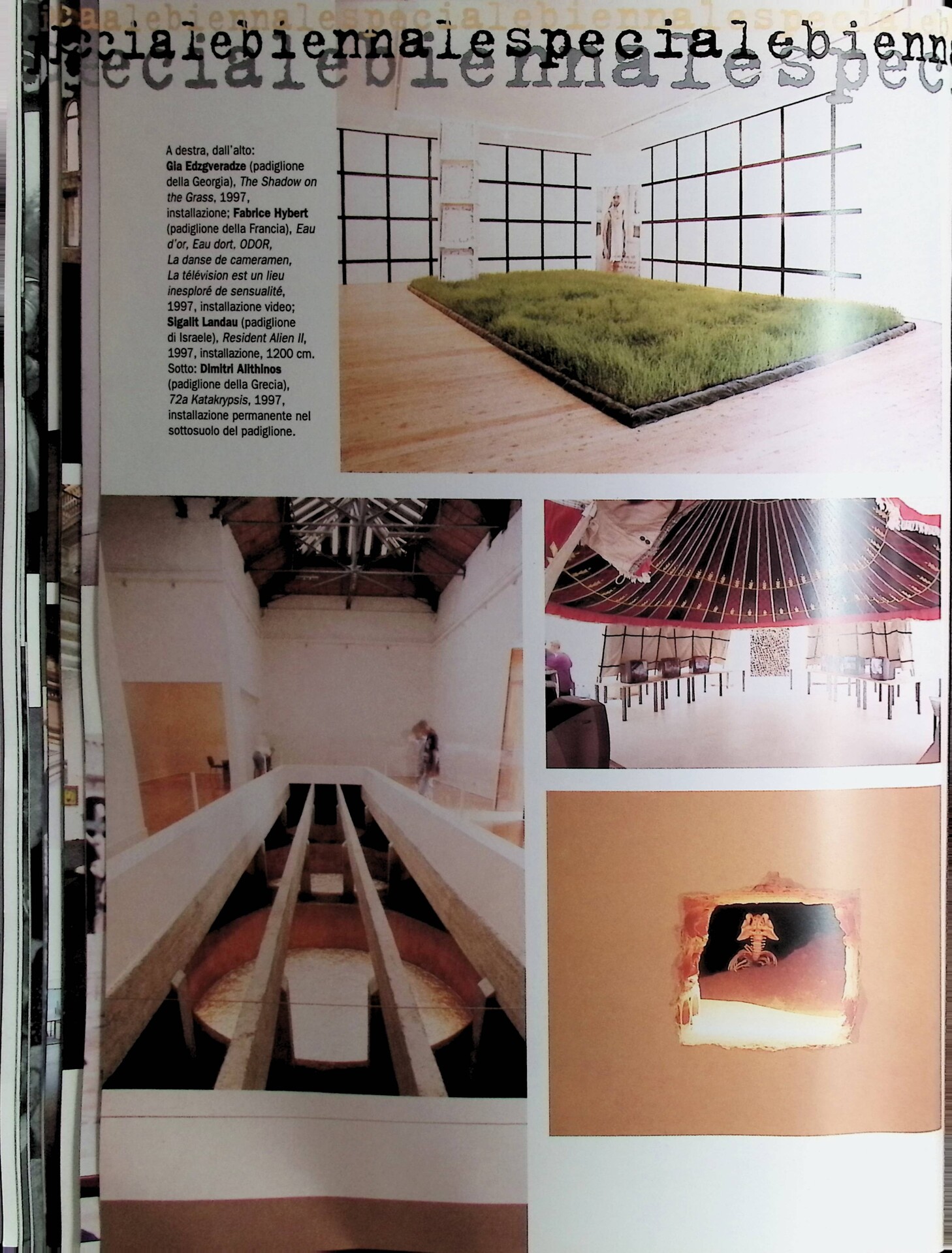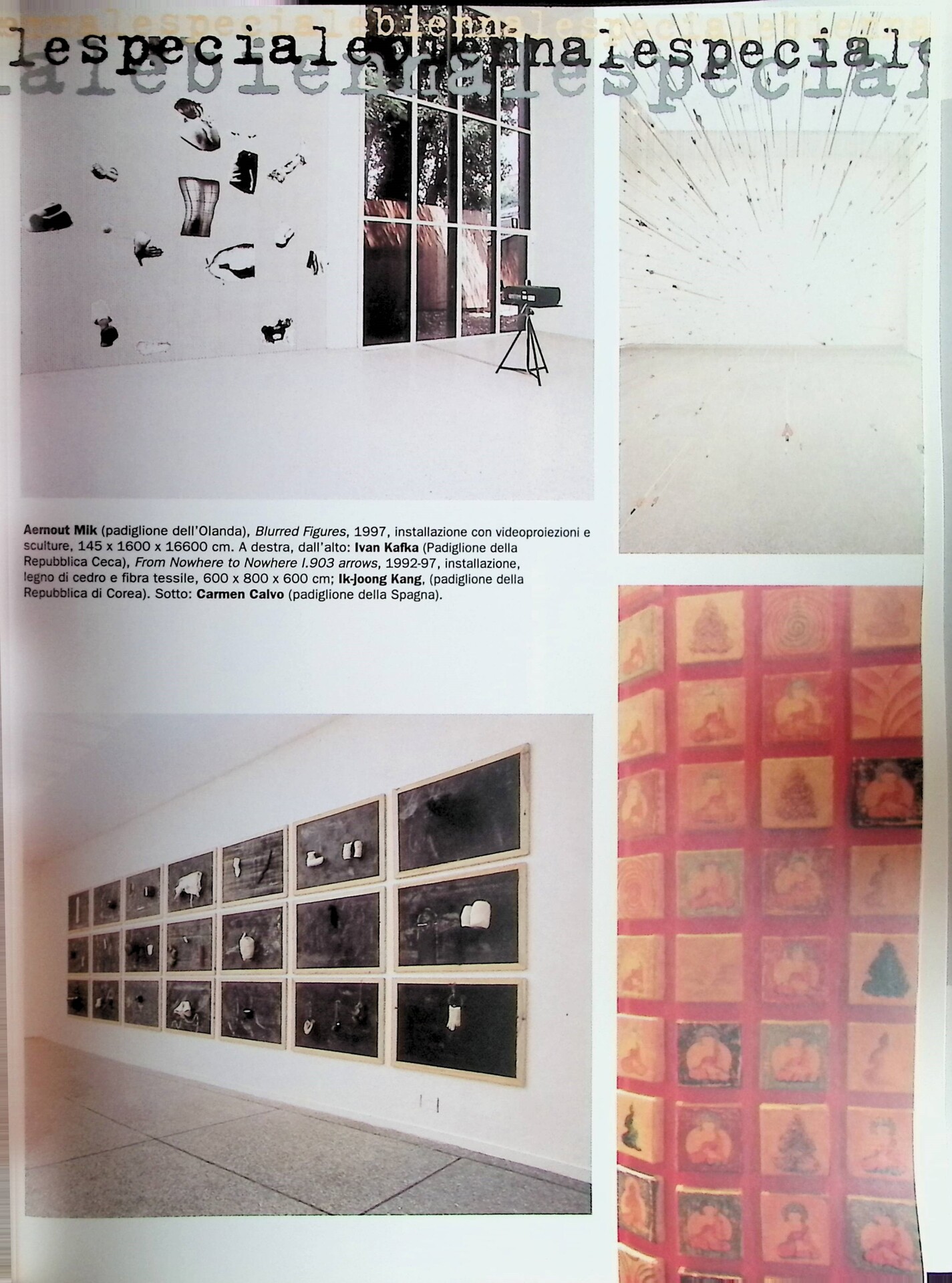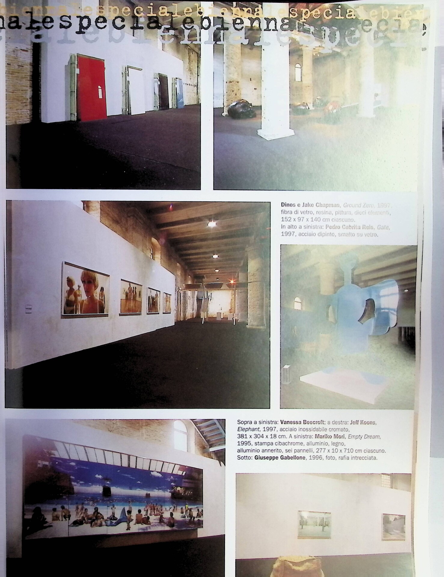 | Descrizione | Reportage fotografico dedicato alle giornate di apertura della Biennale di Venezia 1997, con immagini di Marina Abramović [serba] e una veduta dell'opera Balkan Baroque (1997). Tra le opere esposte figurano lavori di Cai Guo-Qiang [cinese], Mariko Mori [giapponese], Juan Muñoz con soggetti dai tratti asiatici. Compaiono anche vedute dei Padiglioni nazionali, con opere di Gia Edzgveradze [georgiano], Ik-Joong Kang [coreano], Nelson Ramos [uruguayano] e Hyungkoo Lee [coreano]. |