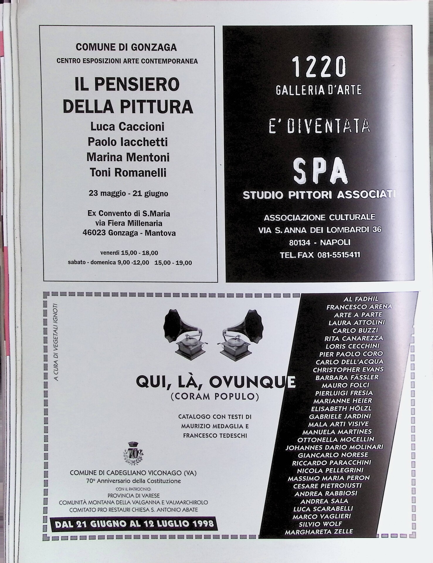| Descrizione | Pubblicità della mostra Qui, Là, Ovunque (Coram Populo) a Cadegliano Viconago, con la partecipazione dell’artista Al Fadhil [iracheno]. |