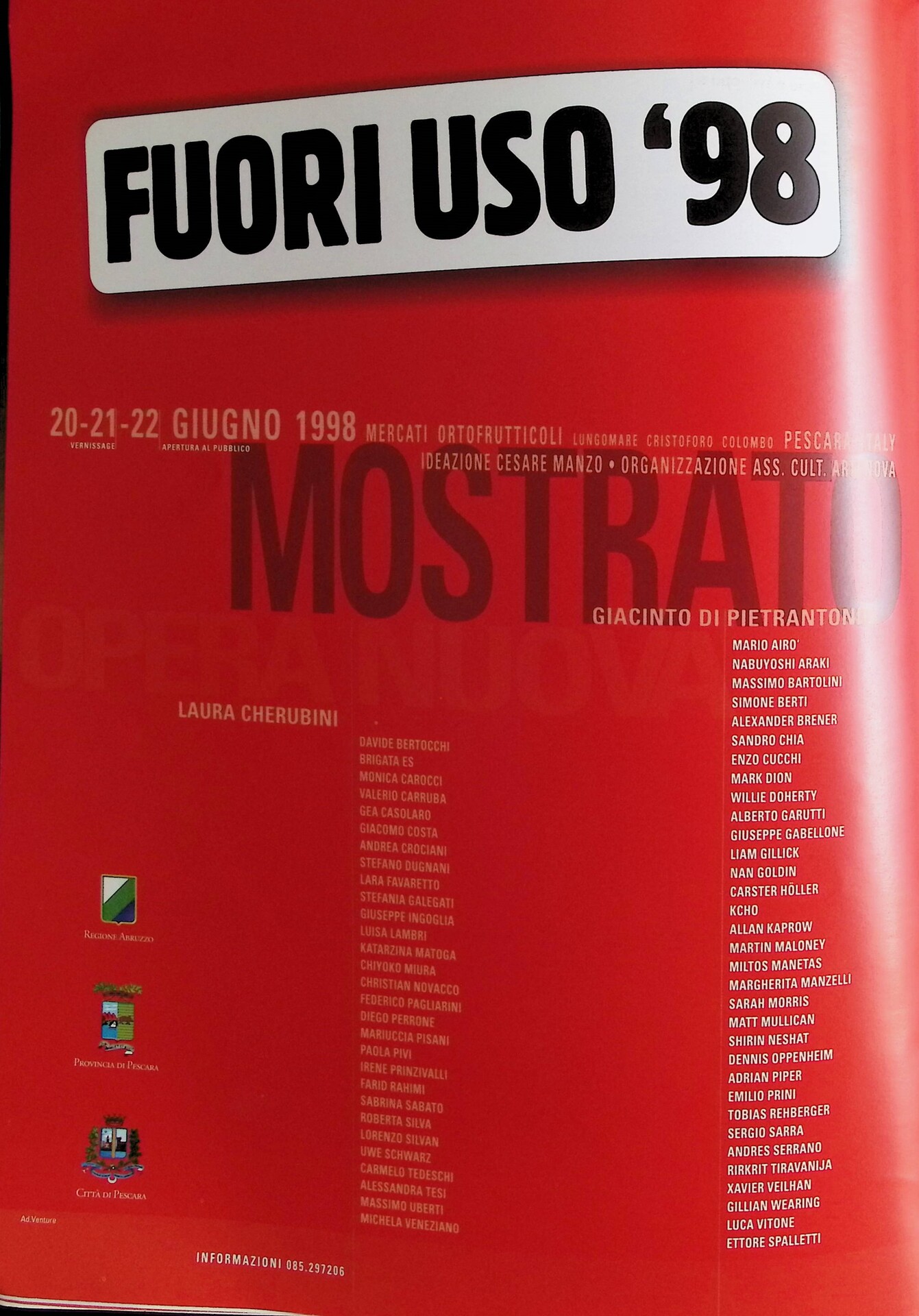 | Descrizione | Pubblicità della mostra Fuori Uso '98 a Pescara, tra gli artisti Nobuyoshi Araki [giapponese], Kcho [cubano], Shirin Neshat [iraniana], Andres Serrano [origini honduregne e afro-cubane], Rirkrit Tiravanija [thailandese], Chiyoko Mura [giapponese] e Alexander Brener [russo]. |