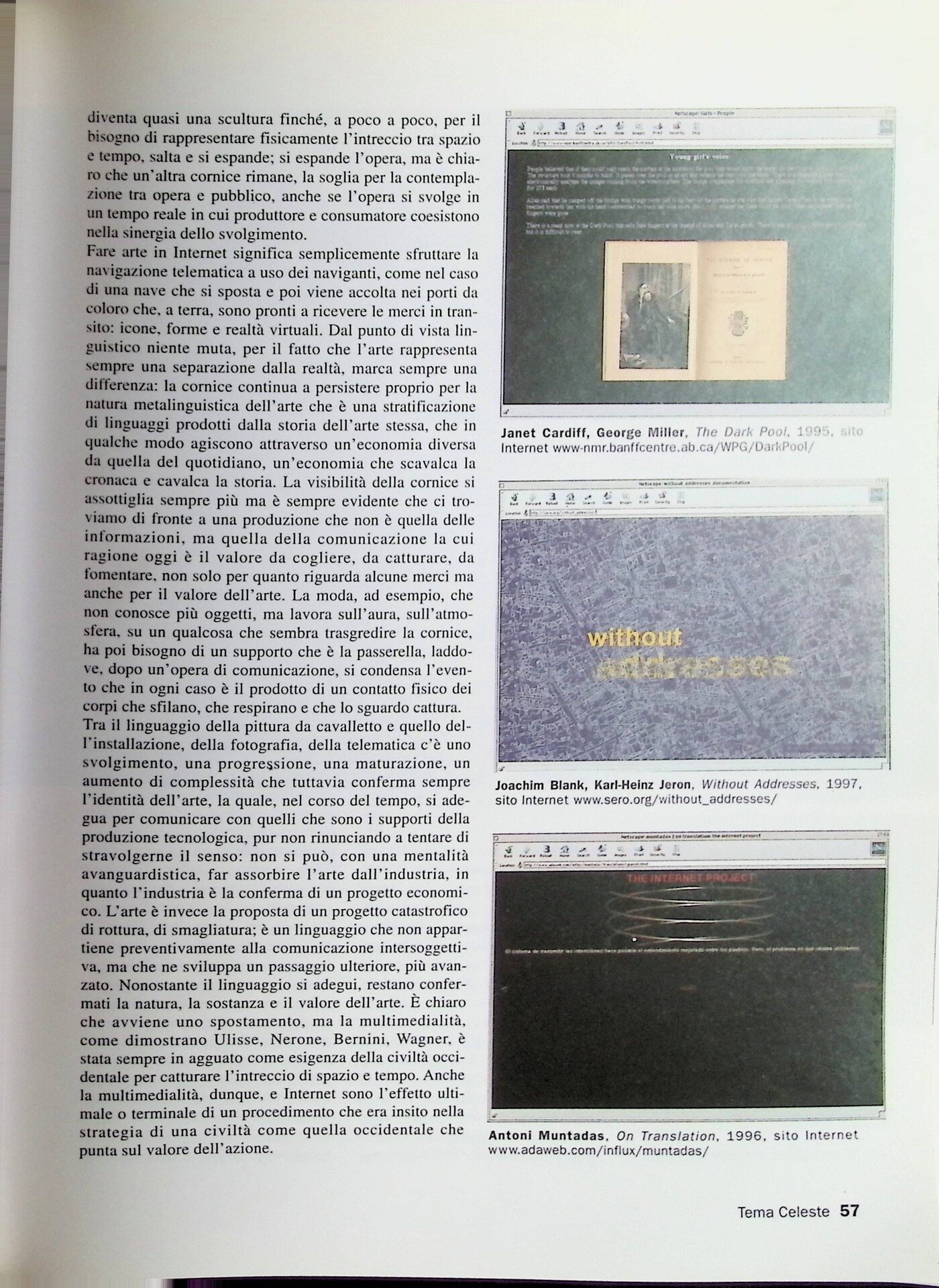 | Cit. bibliografica | Achille Bonito Oliva, Interazione e pubblico mutante, «Tema Celeste», n. 72, gennaio-febbraio 1999, pp. 56-57 |
