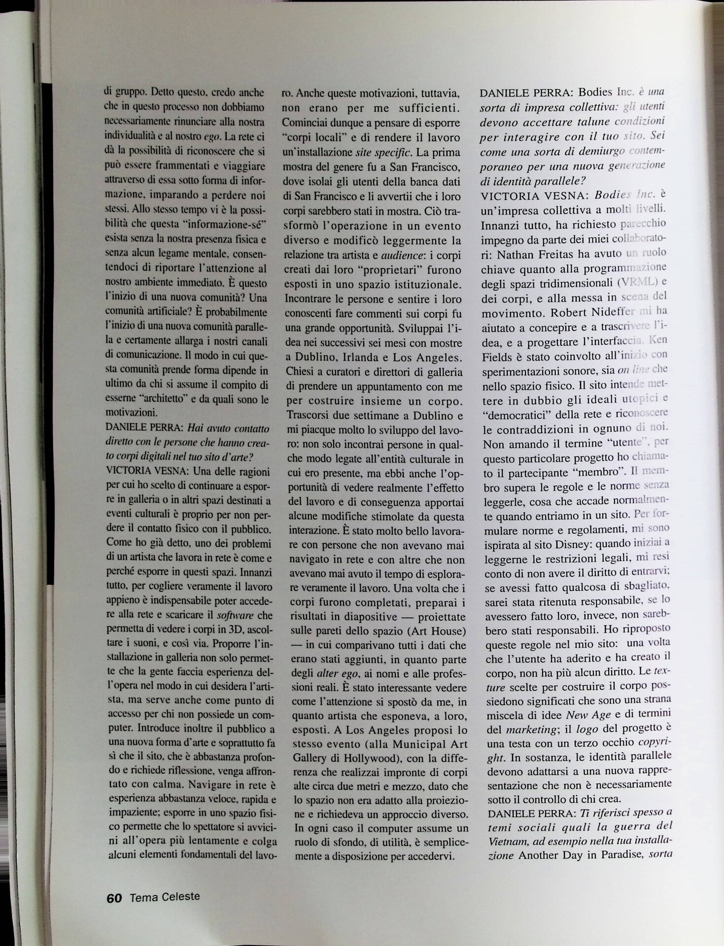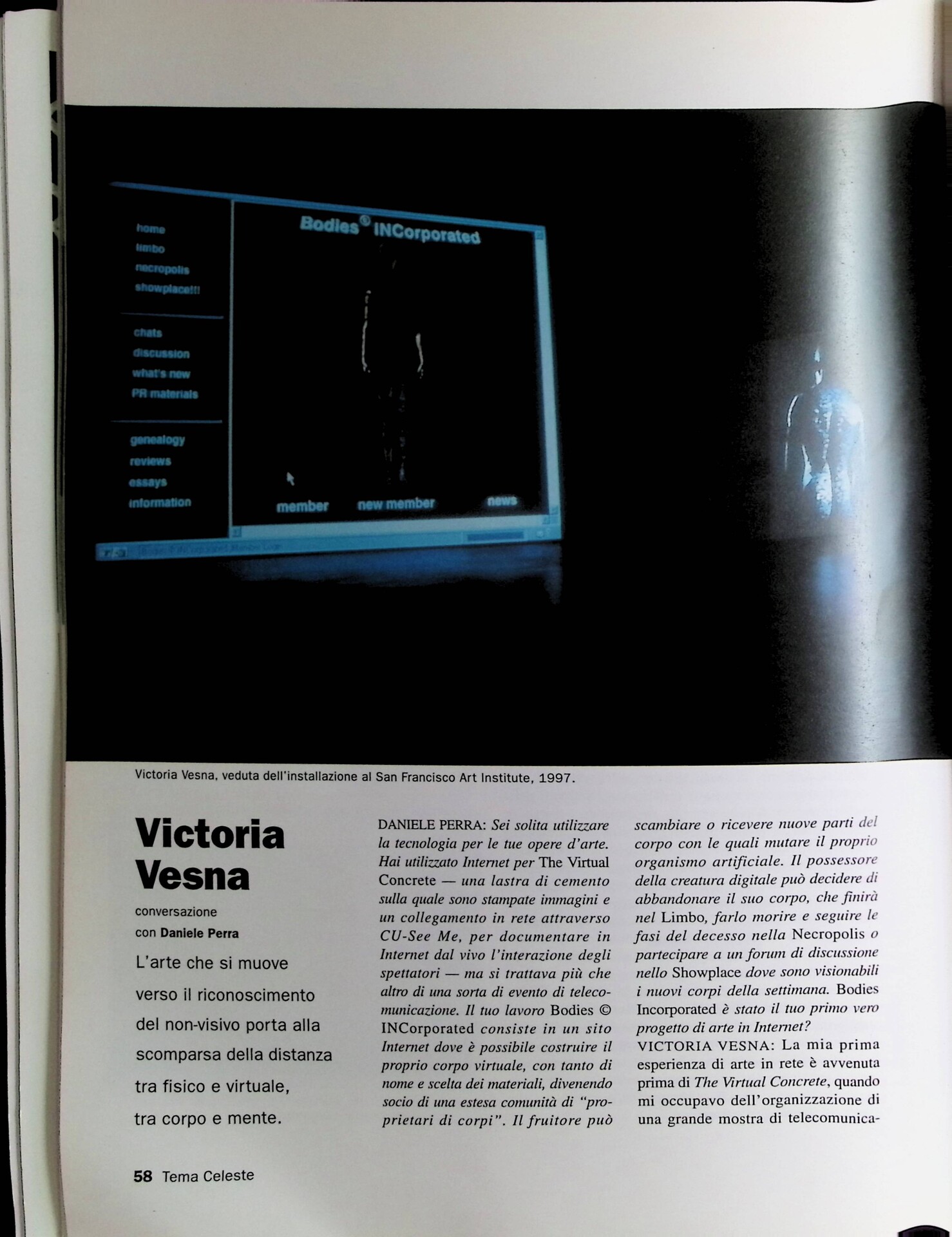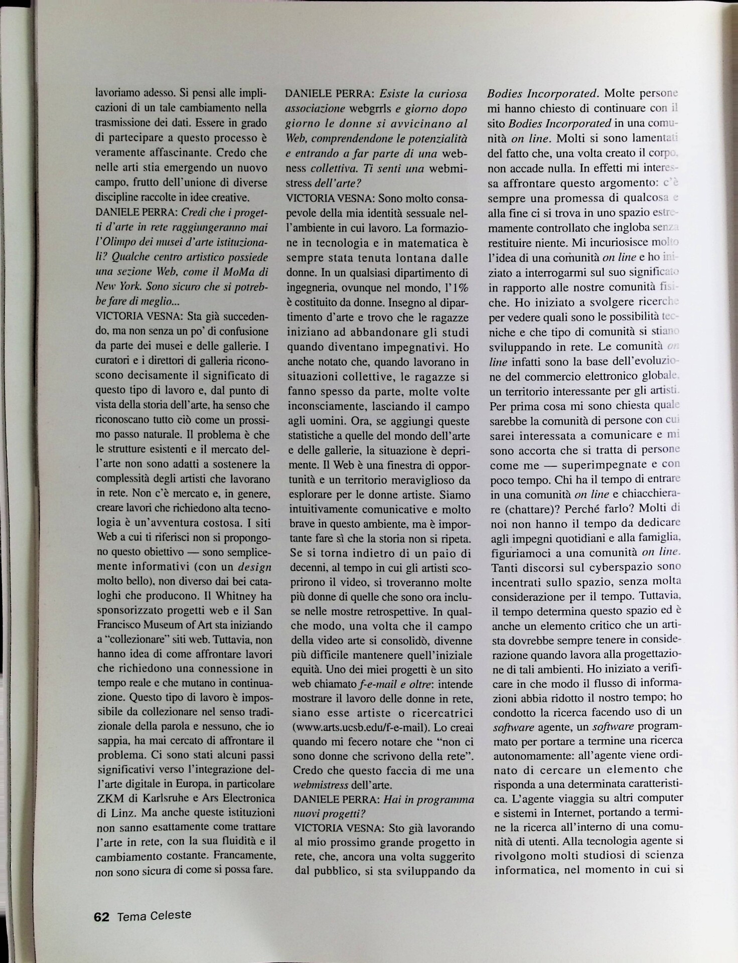 | Cit. bibliografica | Daniele Perra, Victoria Vesna, «Tema Celeste», n. 72, gennaio-febbraio 1999, pp. 58-63 |