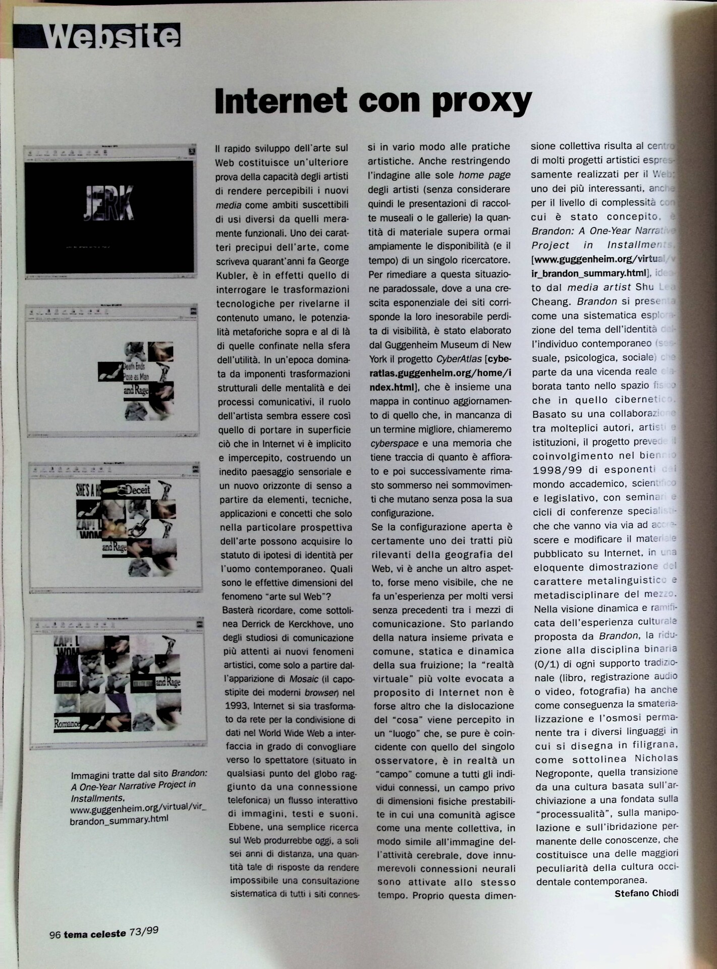 | Cit. bibliografica | Stefano Chiodi, Internet con proxy, «Tema Celeste», n. 73, marzo-aprile 1999, p. 96 |
