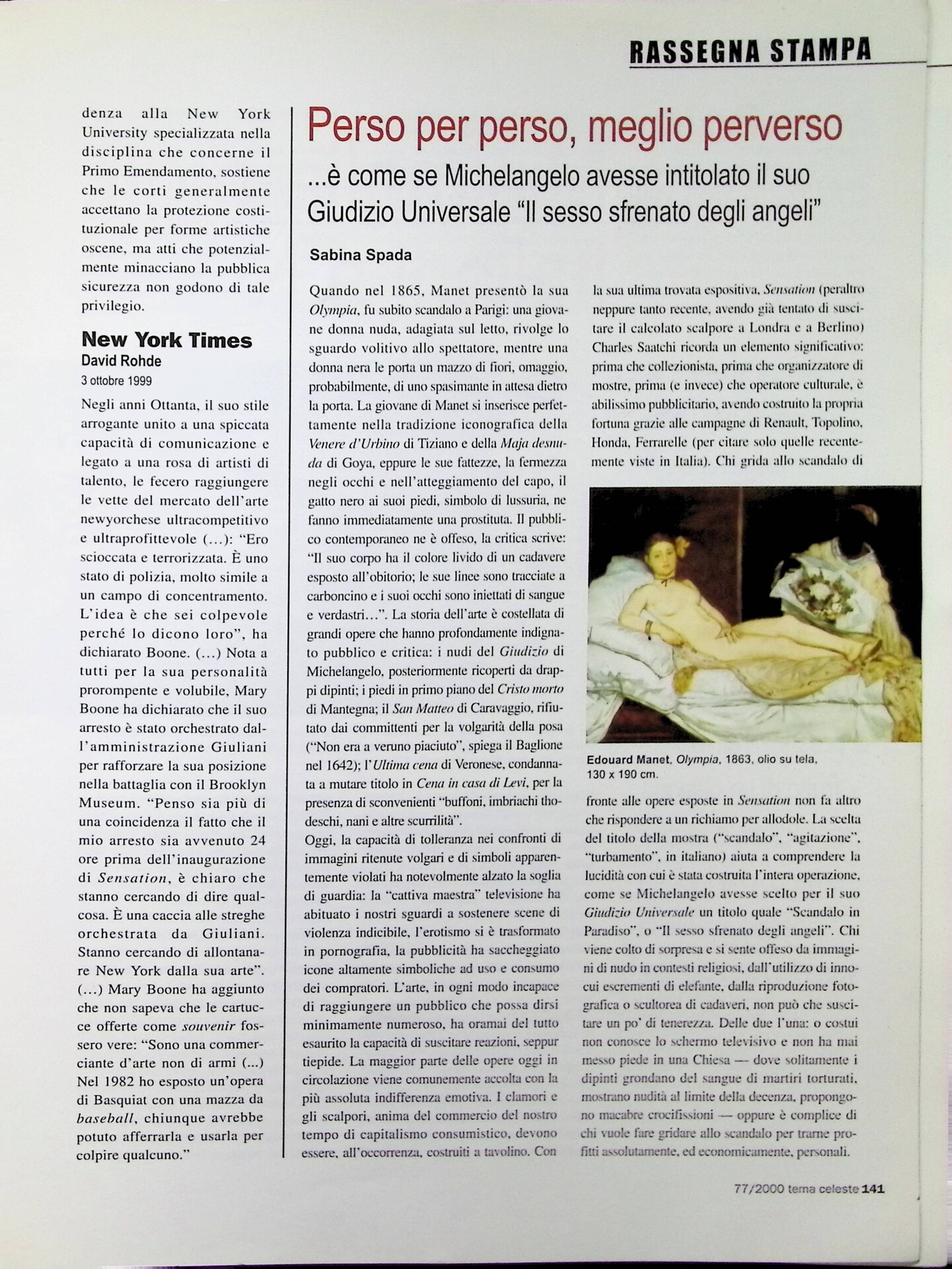 | Descrizione | Articolo dedicato alla mostra Sensations del Brooklyn Museum, con l'opera The Holy Virgin Mary dell'artista Chris Ofili. Si opera un confronto con lo scandalo dsuscitato dall'Olympia di Manet nel 1863. |