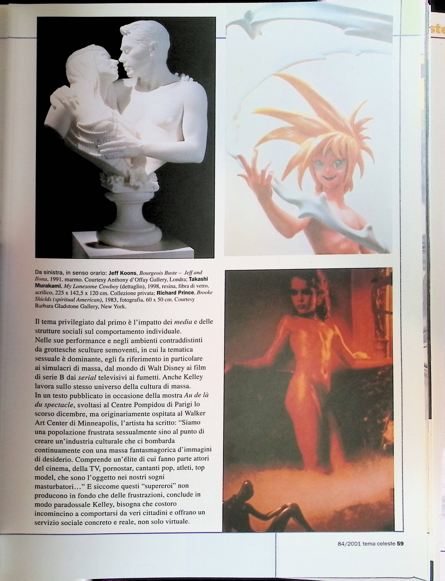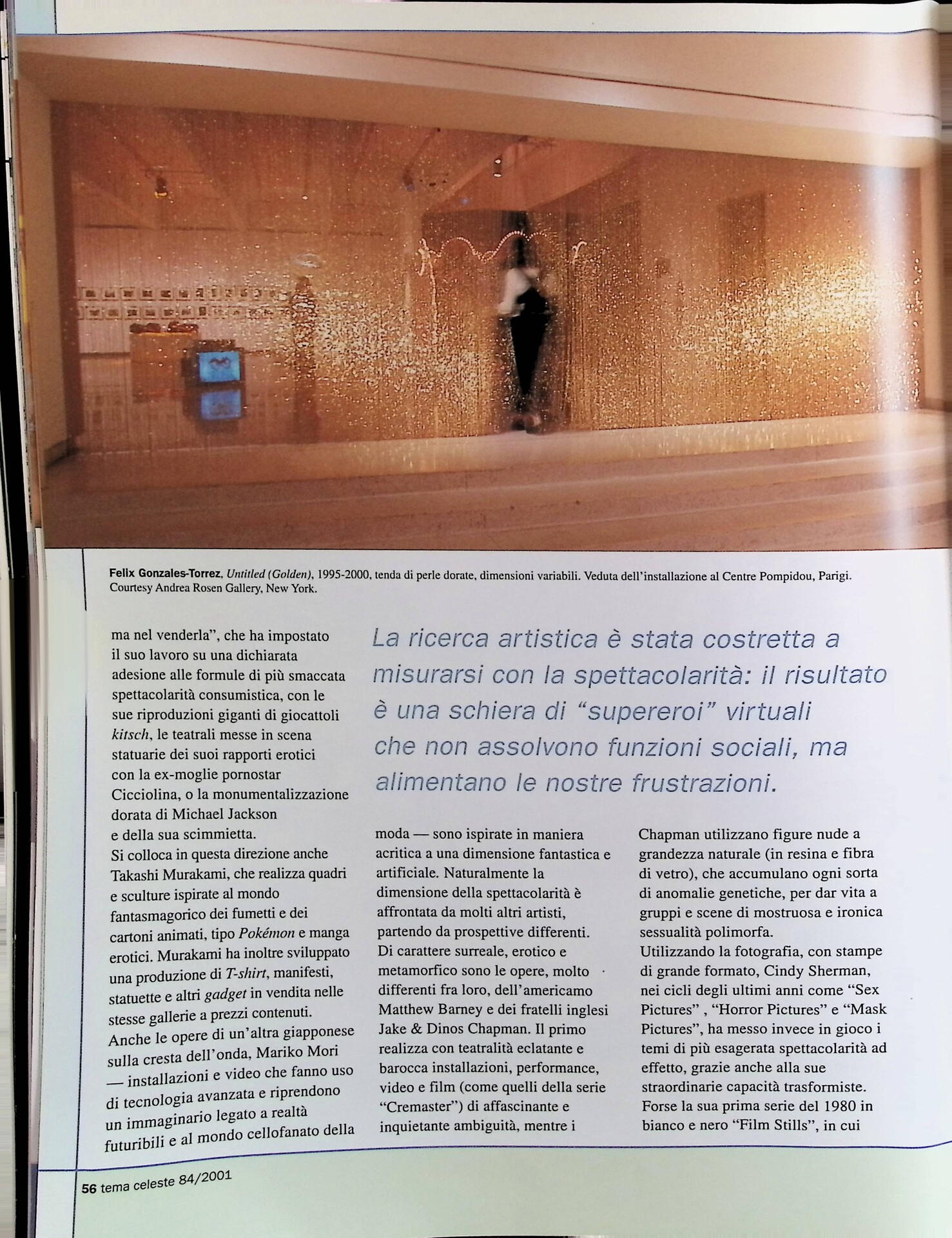| Descrizione | Articolo dedicato alla dimensione spettacolare e commerciale dell’arte, riscontrabile nei lavori di Takashi Murakami [giapponese], ispirati ai fumetti e ai cartoni animati, e in quelli di Mariko Mori [giapponese], basati su tecnologia avanzata e ambientazioni futuristiche. |