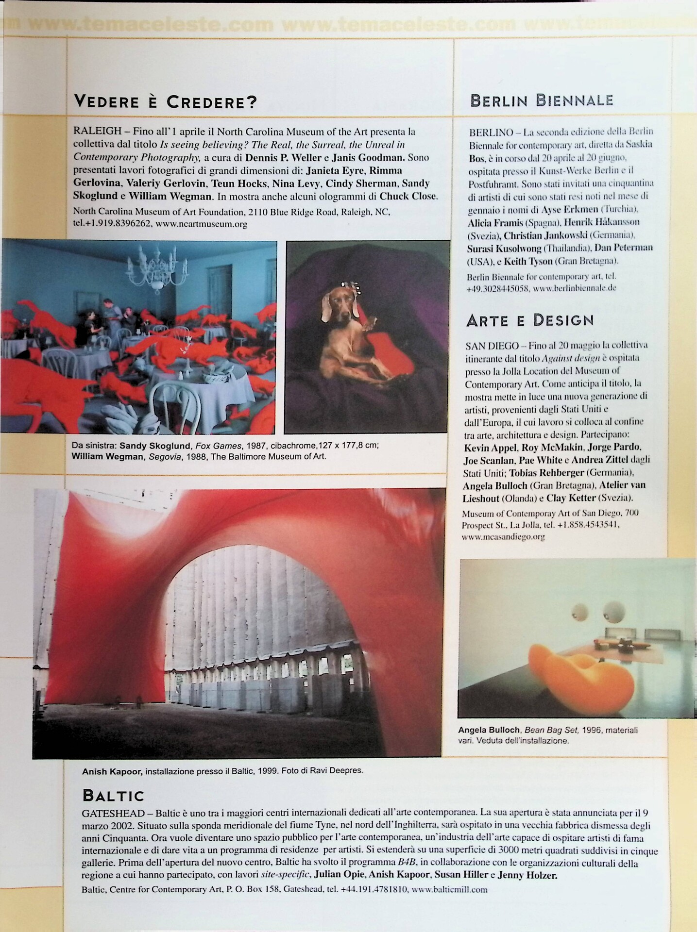 | Descrizione | Segnalazione dell’apertura del centro per l’arte contemporanea Baltic, il cui programma B4B include il lavoro di Anish Kapoor [indiano]. |