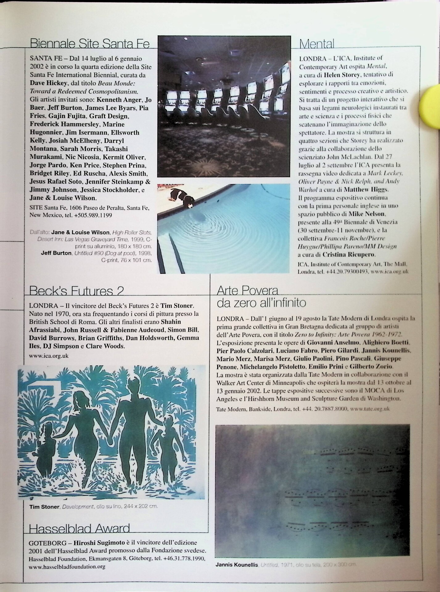 | Descrizione | Segnalazione della quarta edizione della Site Santa Fe International Biennial, Beau Monde: Toward a Redeemed Cosmopolitanism. Tra gli artisti invitati Gajin Fujita, Takashi Murakami [giapponese], Jorge Pardo [cubano], Darryl Montana e Kermit Oliver. |