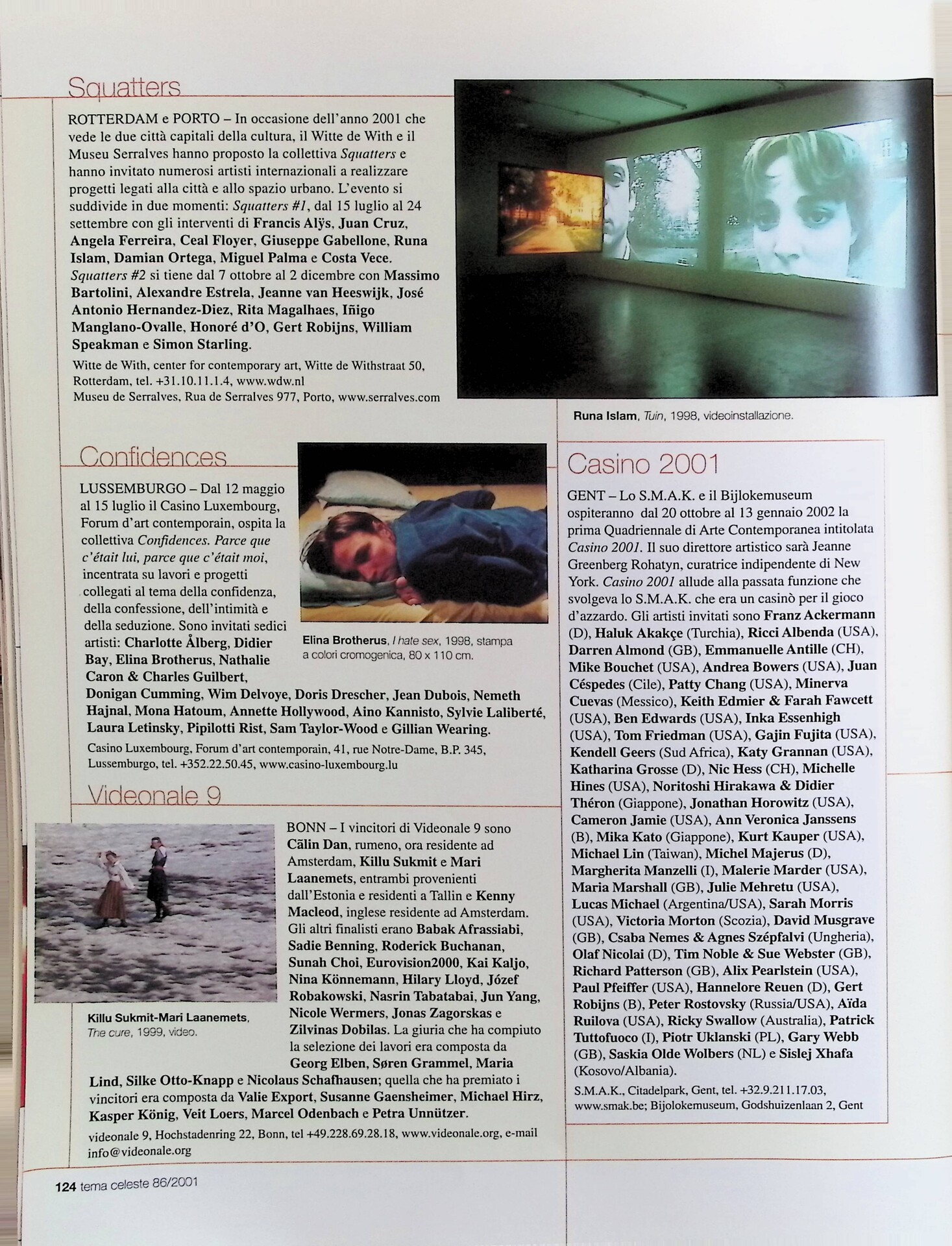 | Descrizione | Segnalazione della collettiva Squatters, ospitata a Porto e a Rotterdam, con la presenza di Angela Ferreira [sudafricana], Ceal Floyer [pakistana], Runa Islam [bangladese], Damian Ortega [messicano], Antonio Hernandez-Diez [venezuelano] e Rita Magalhães [angolana]. |