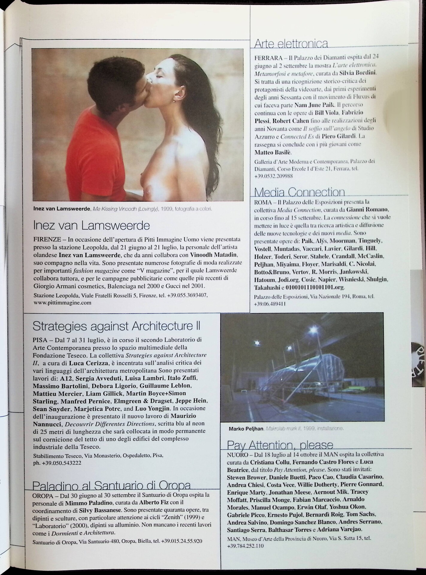 | Descrizione | Segnalazione della collettiva Media Connection al Palazzo delle Esposizioni di Roma, con opere di Maurice Benayoun Seror [algerino], Tatsuo Miyajima e Masaki Takahashi [giapponesi], Ceal Floyer [pakistana], Mona Hatoum [di origini palestinesi], Alexei Shulgin [russo]. |