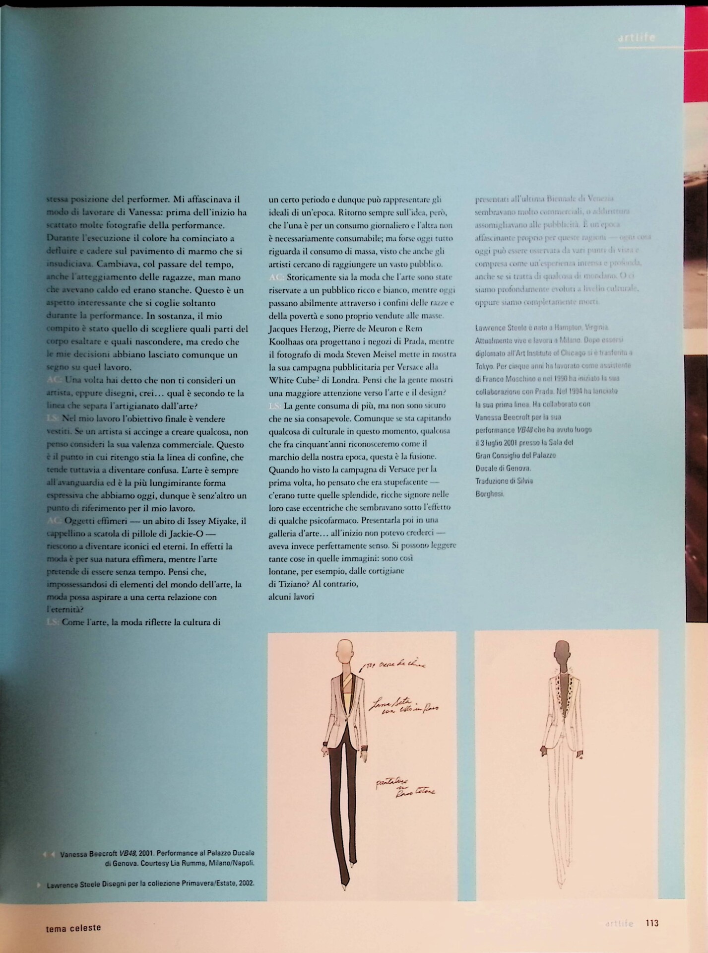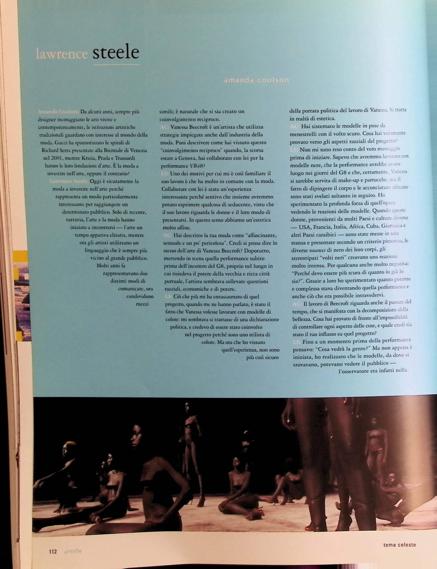 Intervista allo stilista Lawrence Steele sul rapporto tra moda e arte contemporanea, incentrata sulla collaborazione con Vanessa Beecroft per una performance al Palazzo Ducale di Genova nel 2001, con modelle nere di diverse origini. Inizialmente letta come dichiarazione politica, l’azione si rivela una riflessione estetica complessa su razza, potere ed economia.