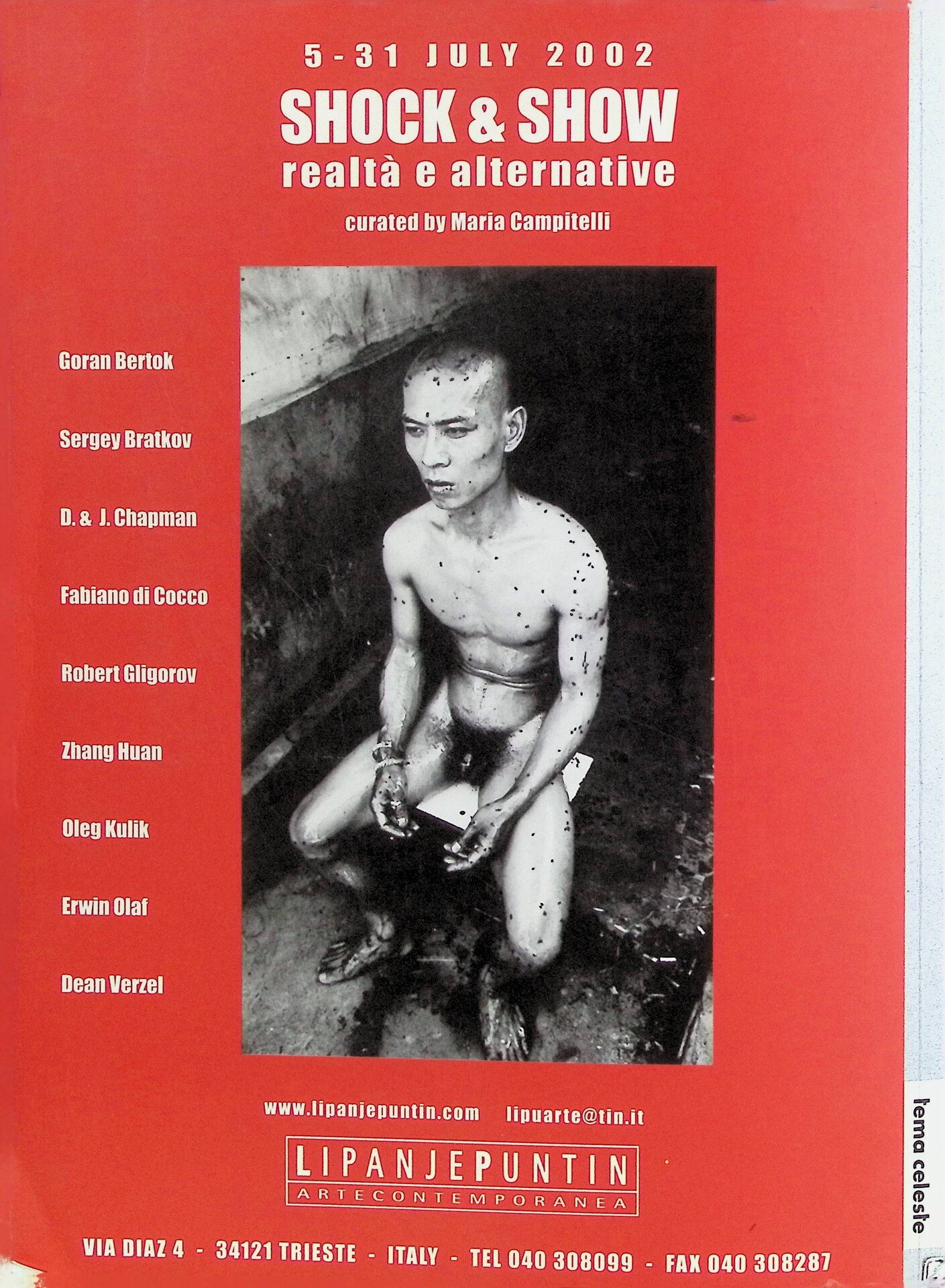 | Descrizione | Pubblicità della mostra Shock & Show, realtà e alternative alla Galleria LipanjePuntin di Trieste, con la partecipazione di Sergey Bratkov [ucraino], Zhang Huan [cinese] e Oleg Kulik [russo]. |