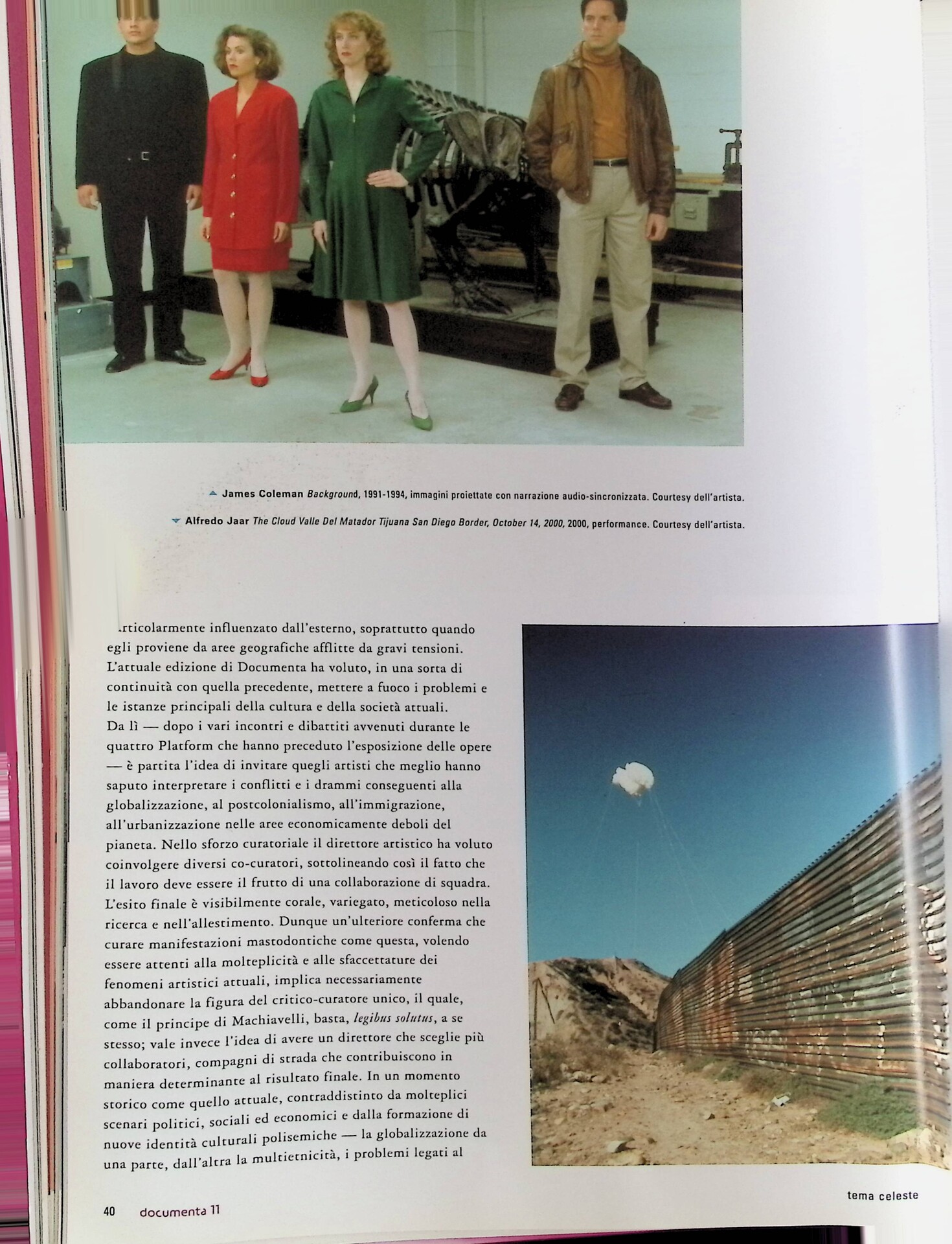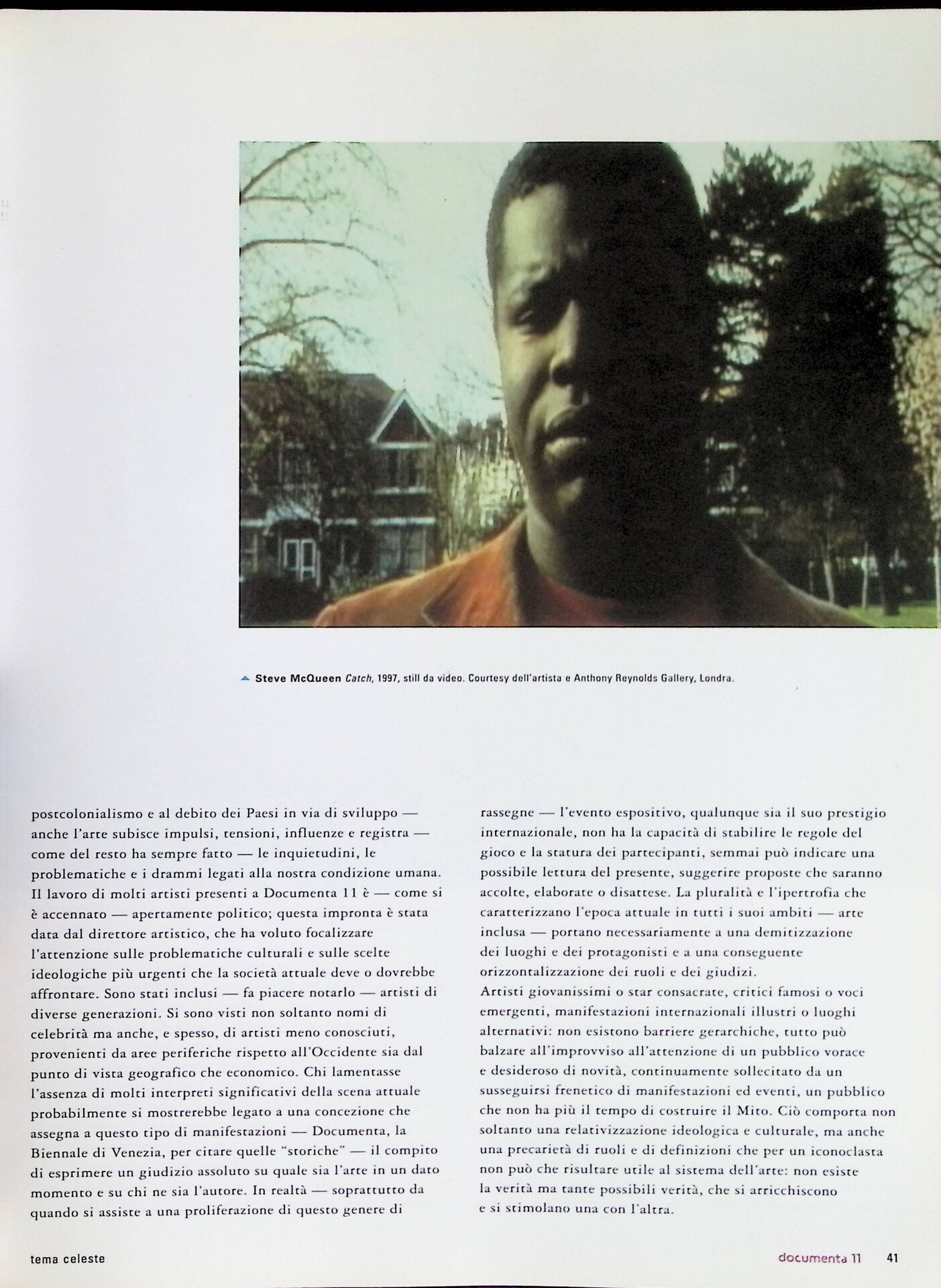 | Descrizione | Articolo dedicato a Documenta 11, focalizzata sulla diversità culturale e sulle tensioni della globalizzazione. La mostra affronta temi come giustizia, postcolonialismo, diritti umani e urbanizzazione, privilegiando video e documentari come strumenti politici. Coinvolge artisti da contesti marginali, tra cui Zarina Bhimji [ugandese] e Alfredo Jaar [cileno]. |