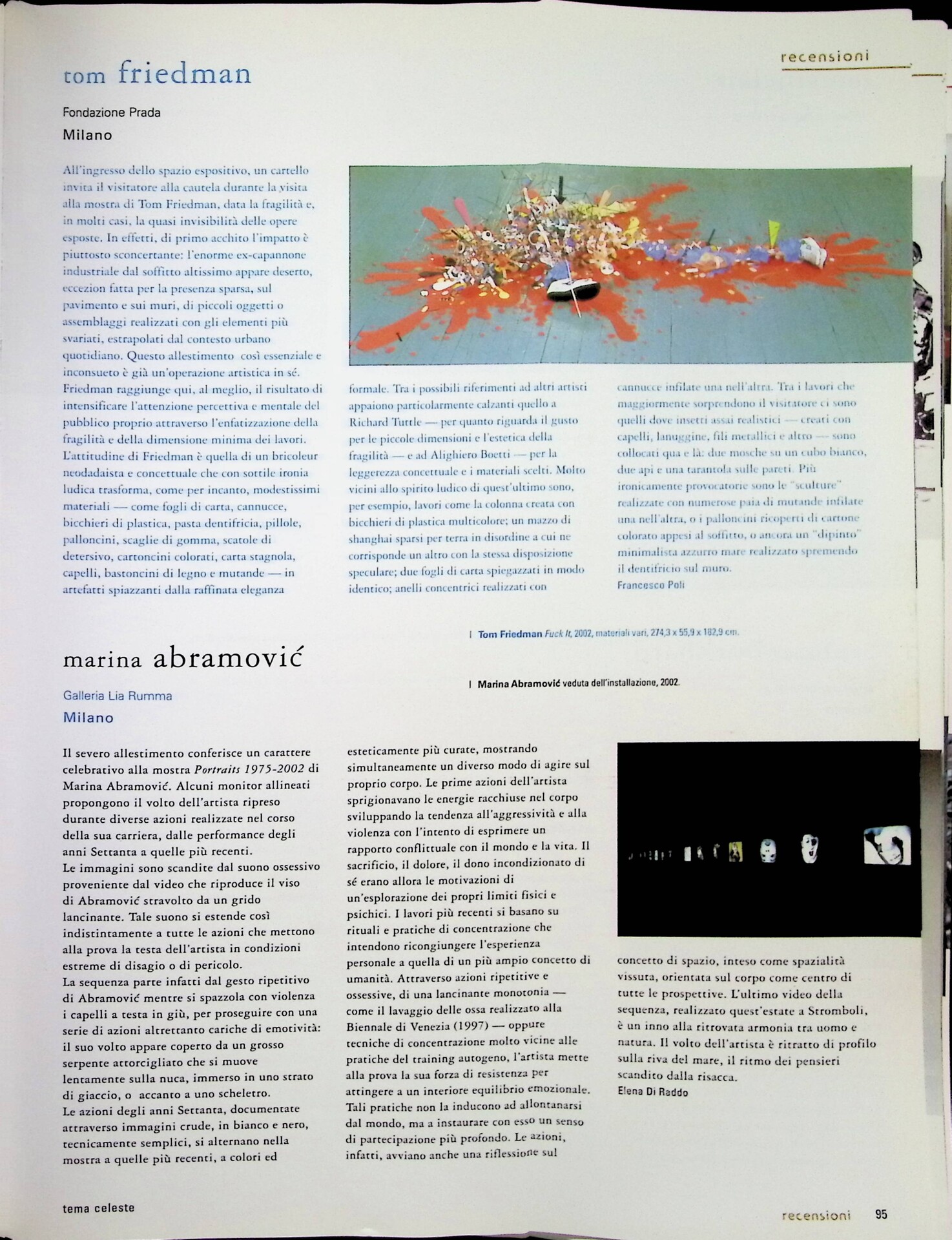 Elena Di Raddo, Marina Abramović, «Tema Celeste», n. 95, gennaio-febbraio 2003, p. 95