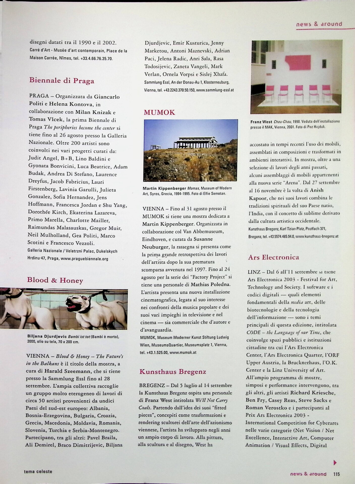 | Descrizione | Segnalazione della mostra Blood & Honey - The Future's in the Balkans alla Sammlung Essl di Vienna, con la partecipazione di artisti extraoccidentali. |