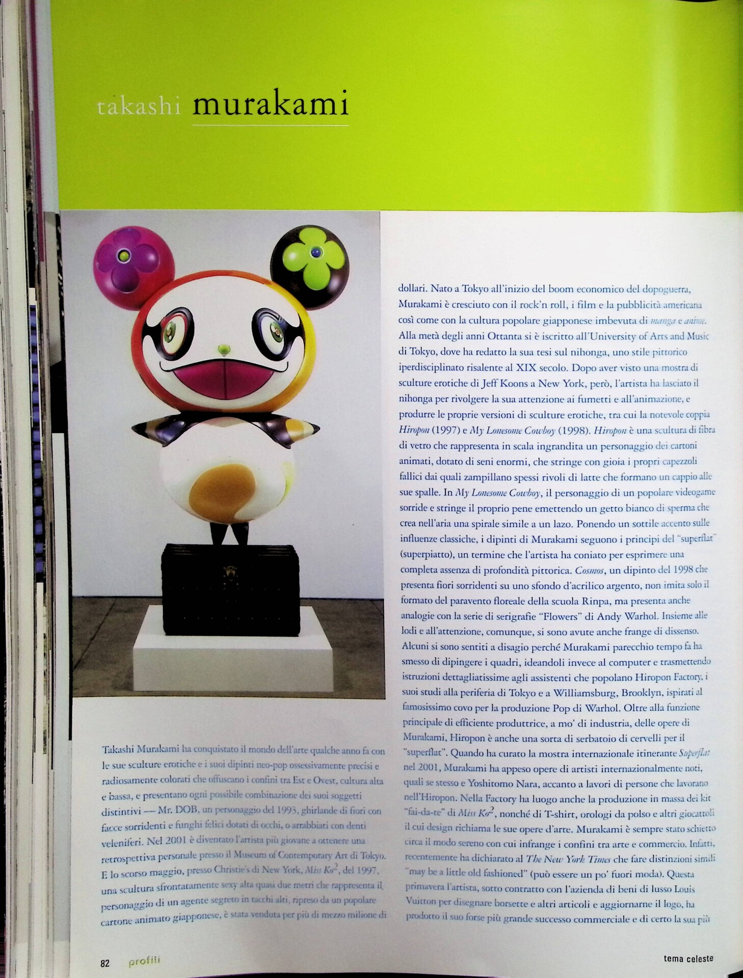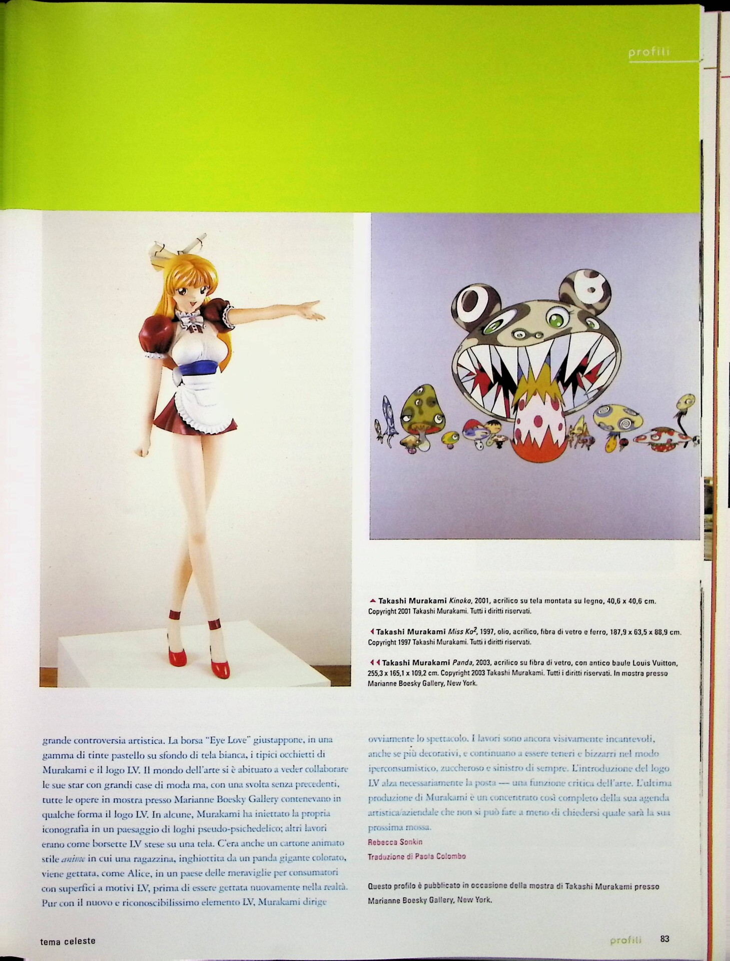 | Cit. bibliografica | Rebecca Sonkin, Takashi Murakami, «Tema Celeste», n. 99, settembre-ottobre 2003, pp. 82-83 |