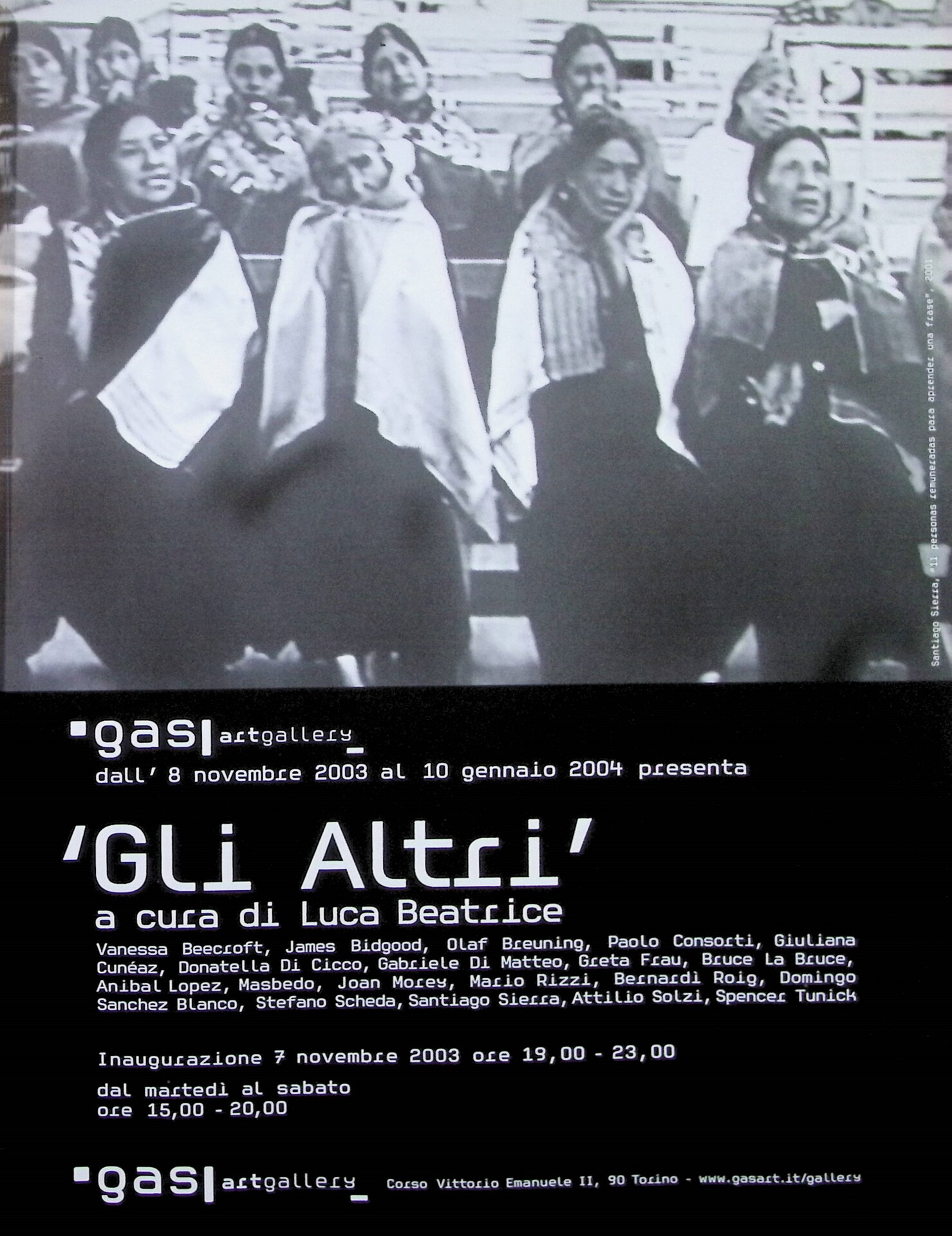 | Descrizione | Pubblicità della mostra Gli Altri alla GasArt Gallery di Torino, con la partecipazione di Aníbal López [guatemalteco]. |