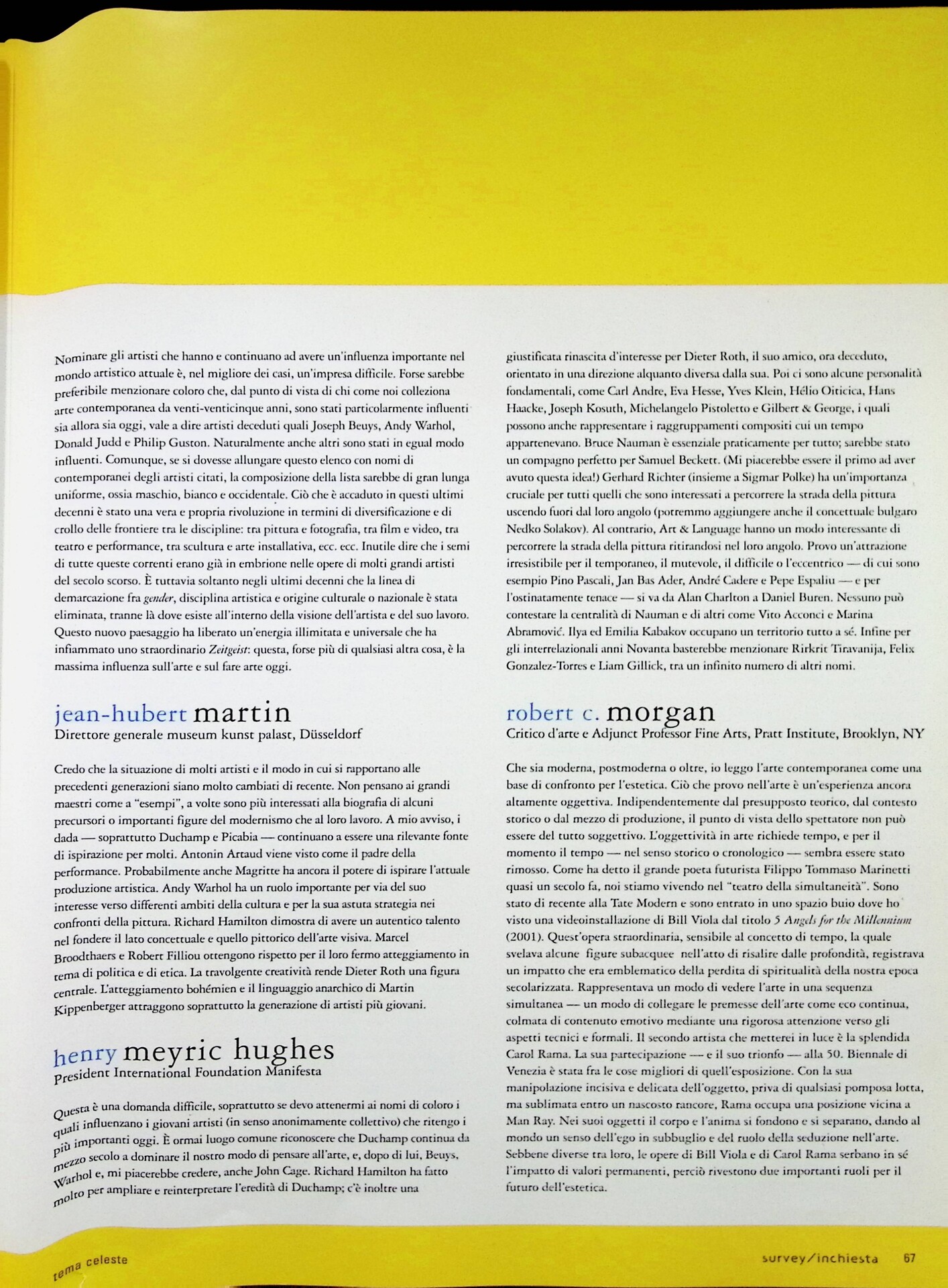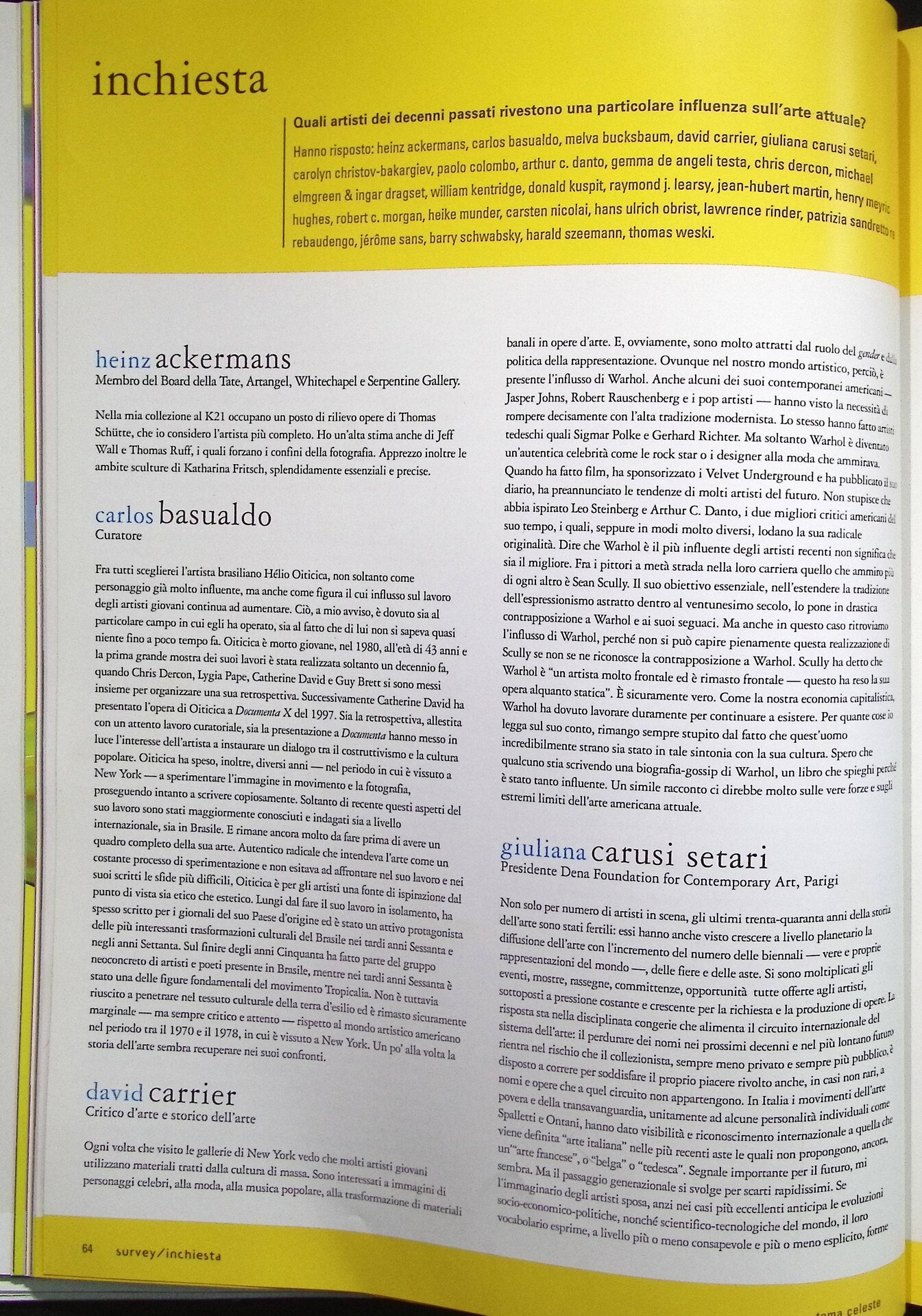 | Descrizione | Inchiesta sugli artisti dei decenni passati che hanno maggiormente influenzato la scena contemporanea. Tra le risposte raccolte, Carlos Basualdo segnala Hélio Oiticica [brasiliano], Giuliana Carusi Setari cita Jean-Michel Basquiat, Michael Elmgreen e Ingar Dragset indicano Félix González-Torres [cubano], Henry Meyric Hughes menziona Rirkrit Tiravanija [thailandese], Barry Schwabsky sceglie Marlene Dumas [sudafricana], mentre Harald Szeemann indica Zhang Peili [cinese], Georges Adeagbo [beninese] e Jun Nguyen-Hatsushiba [giapponese-vietnamita]. |