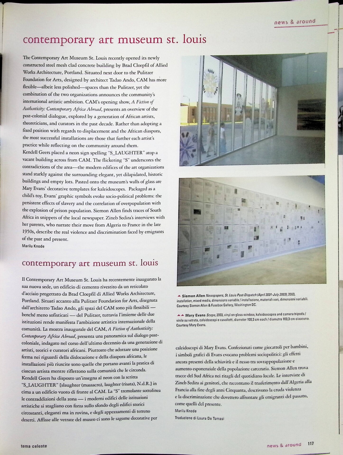 Marilu Knode, Contemporary art museum St. Louis, «Tema Celeste», n. 100, novembre-dicembre 2003, p. 117