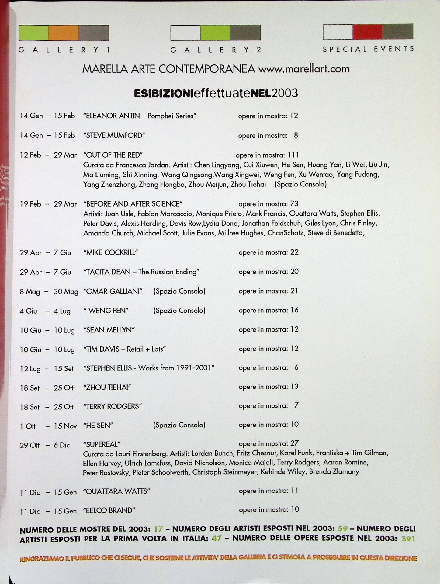 | Descrizione | Pubblicità della programmazione della galleria Marella Arte Contemporanea di Milano, che include diverse mostre dedicate ad artisti extraoccidentali, tra cui Out of Red, Before and After Science, e personali degli artisti Weng Fen, Zhou Tiehai, He Sen [cinesi] e Ouattara Watts [ivoriano]. |