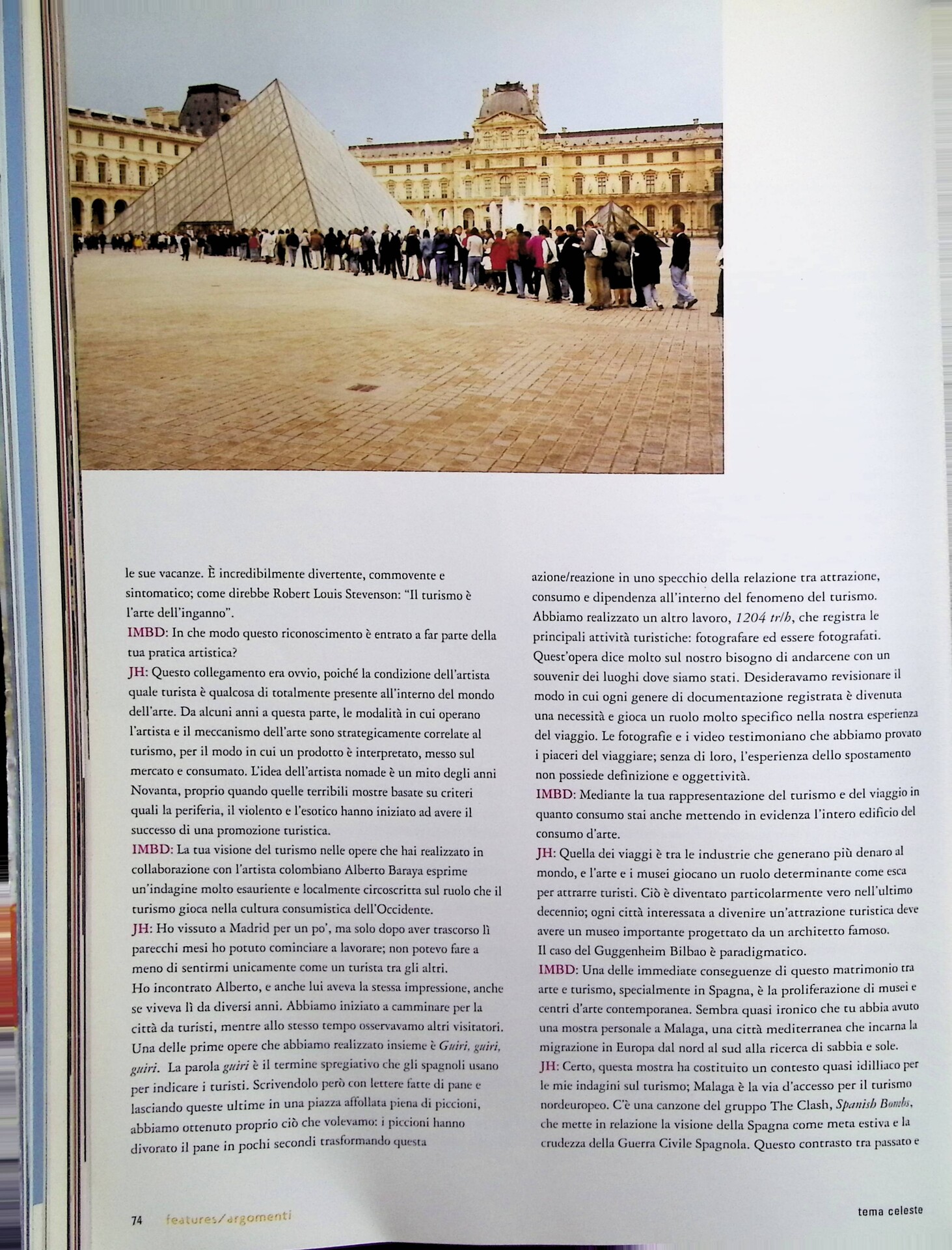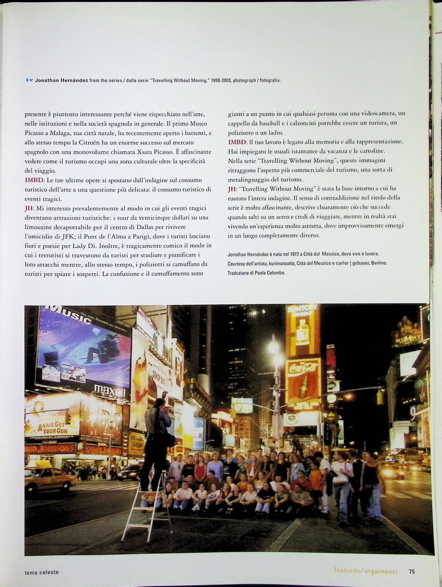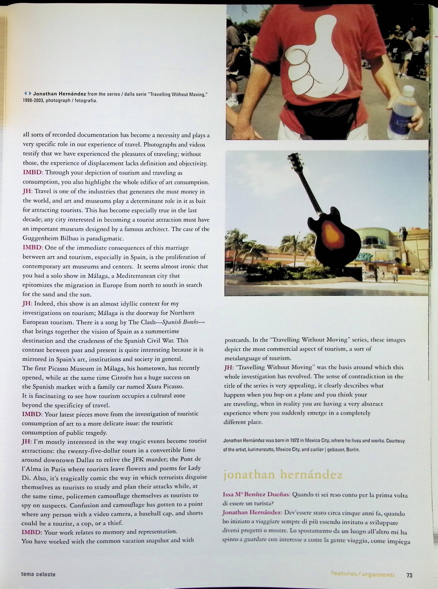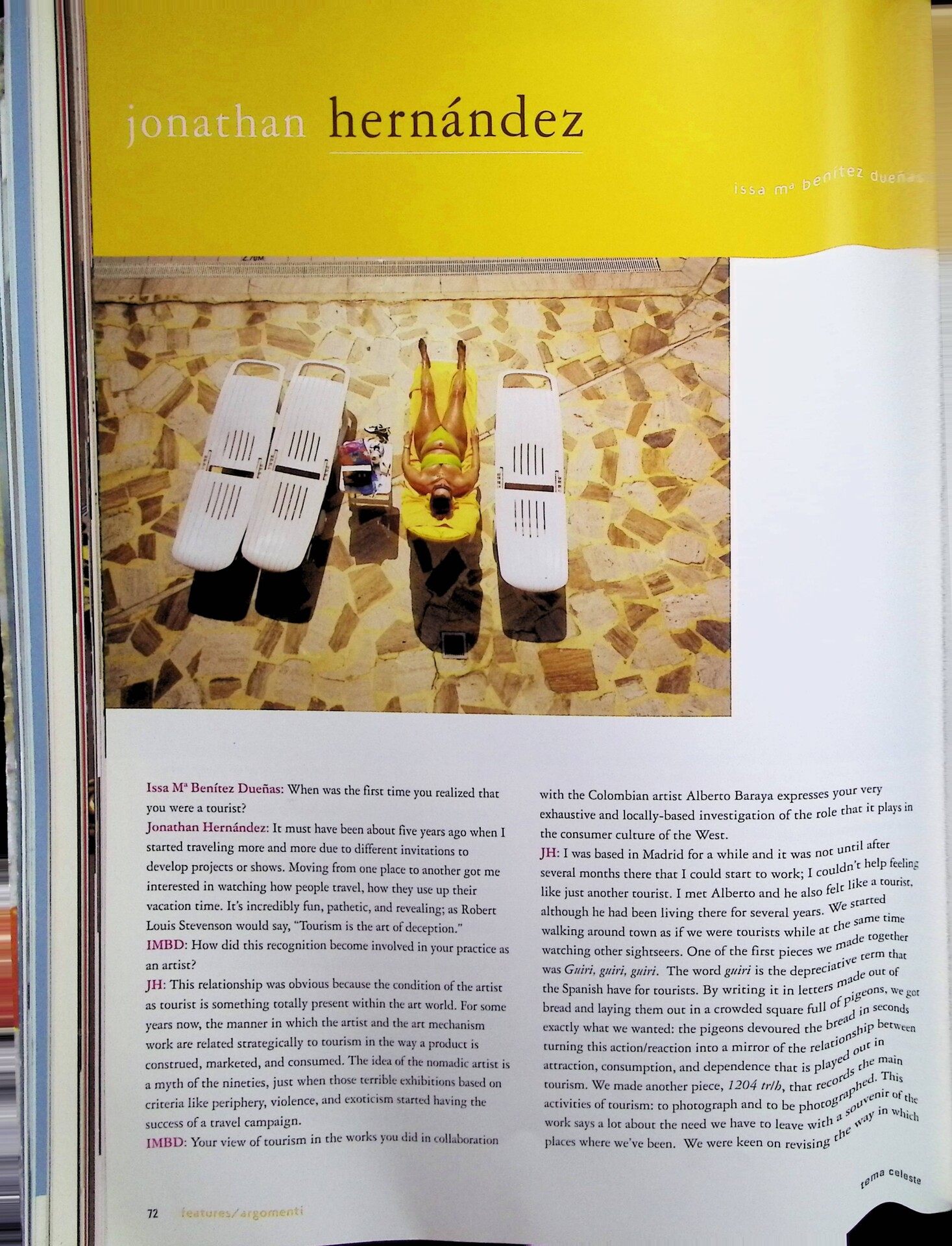 | Descrizione | Intervista a Jonathan Hernàndez [messicano] sul tema dell'artista-turista. Hernàndez rifiuta l'idea dell'artista nomade, legata alle mostre che promuovevano la periferia e l’esotismo come attrazioni turistiche. Le sue opere, realizzate con Alberto Baraya [colombiano], indagano il ruolo del turismo nella cultura consumistica occidentale. |