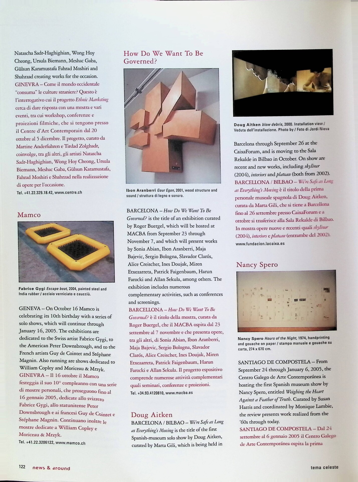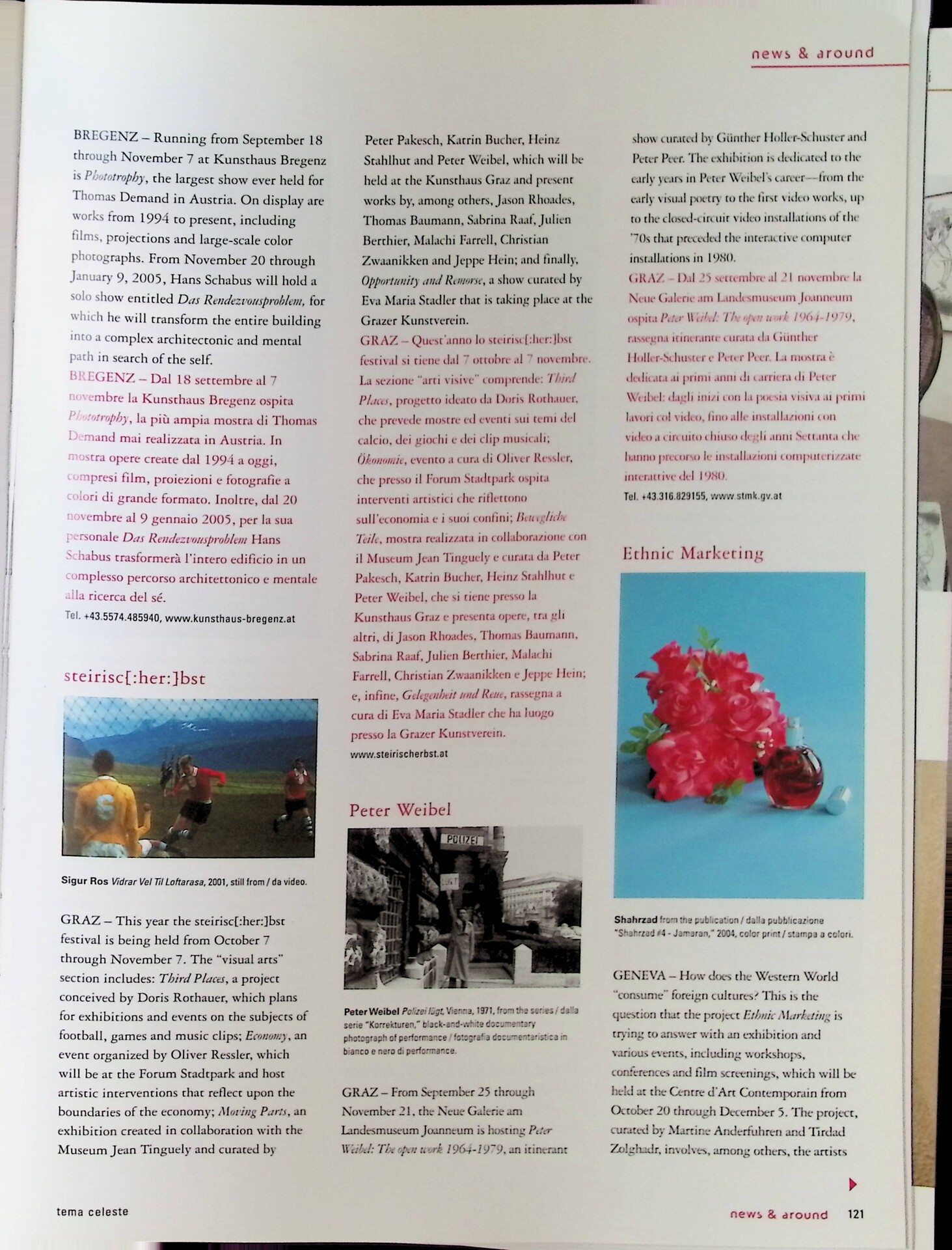 | Descrizione | Segnalazione del progetto Ethnic Marketing, che si interroga su "come il mondo occidentale consuma le culture straniere". Il progetto si sviluppa attraverso una mostra e vari eventi al Centre d'Art Contemporain di Ginevra, con la partecipazione di artisti extraoccidentali. |