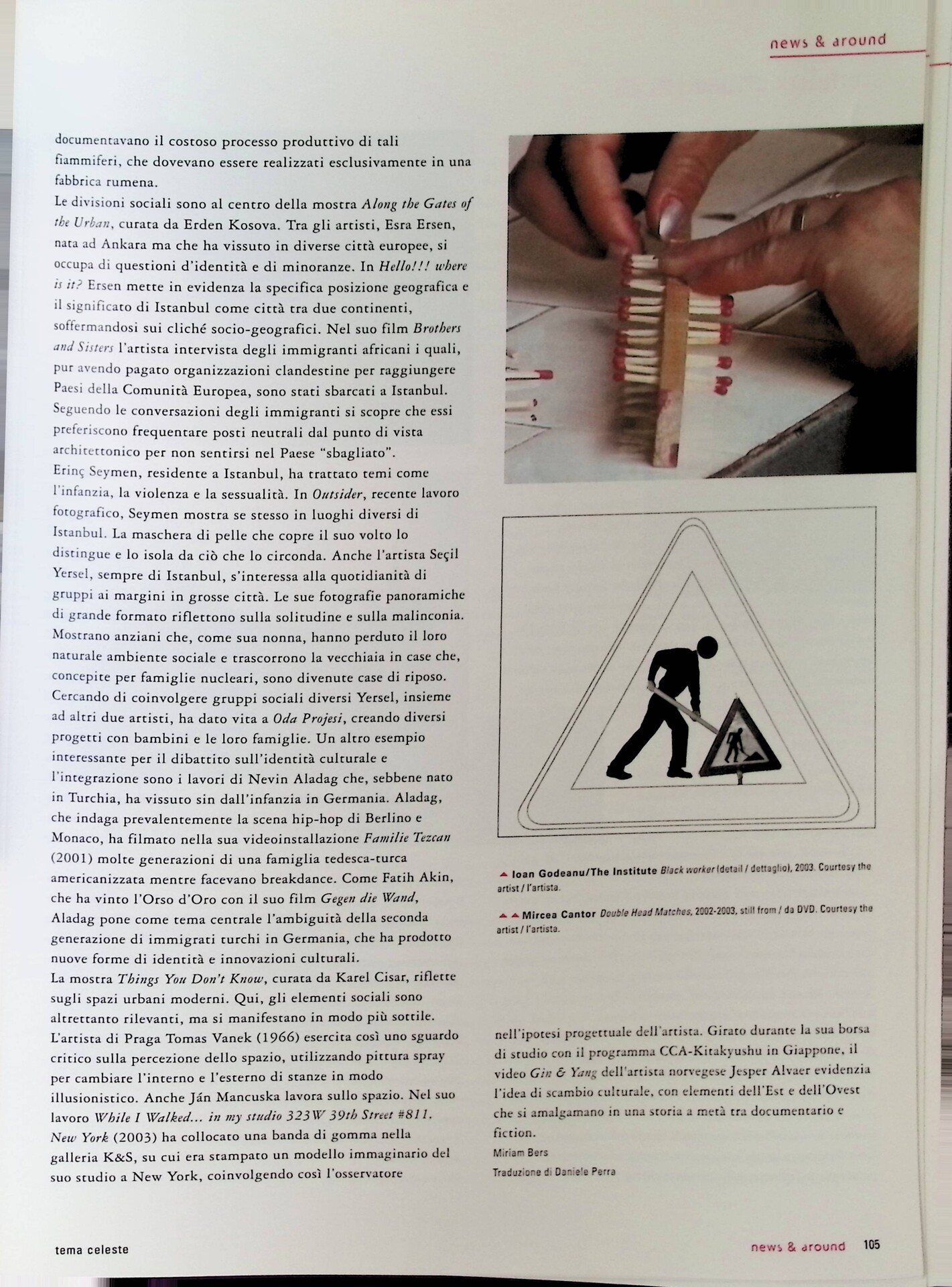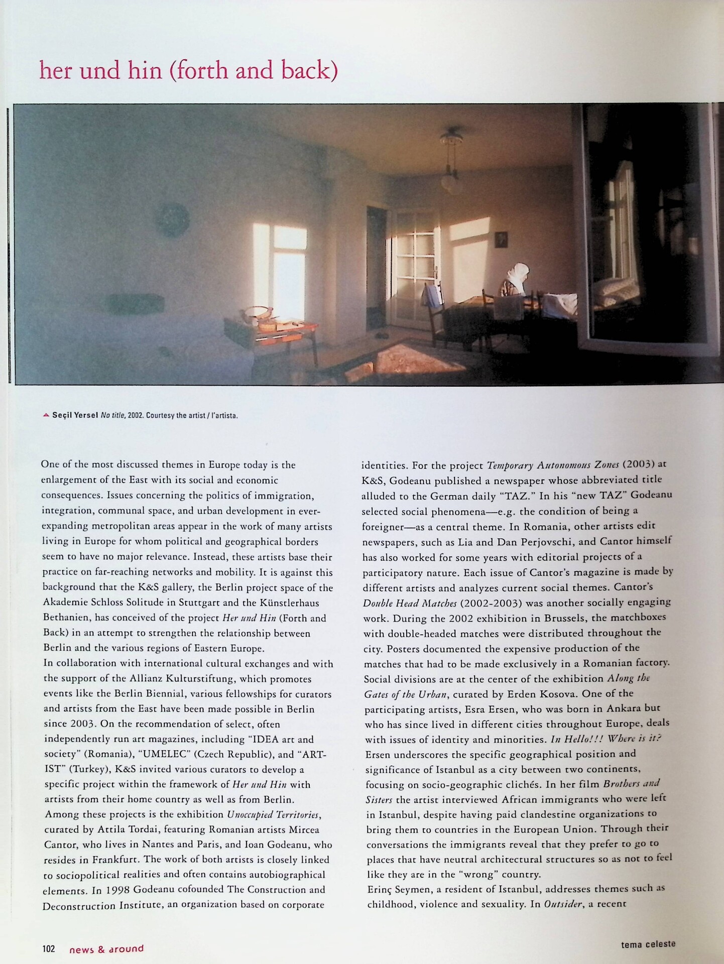 | Descrizione | Segnalazione del progetto Her und hin (forth and back), realizzato dal K&S e dal Künstlerhaus Bethanien, che mira a rafforzare il legame tra Berlino e le regioni dell'Europa dell'Est. Il progetto include mostre come Unoccupied Territories e Along the Gates of the Urban, con la partecipazione di Esra Ersen, Erinç Seymen, Seçil Yersel e Nevin Aladag [turchi]. |