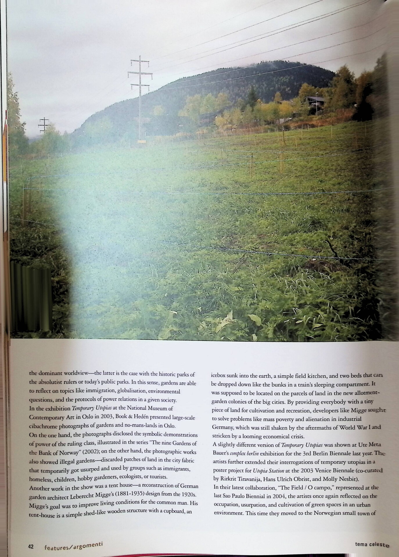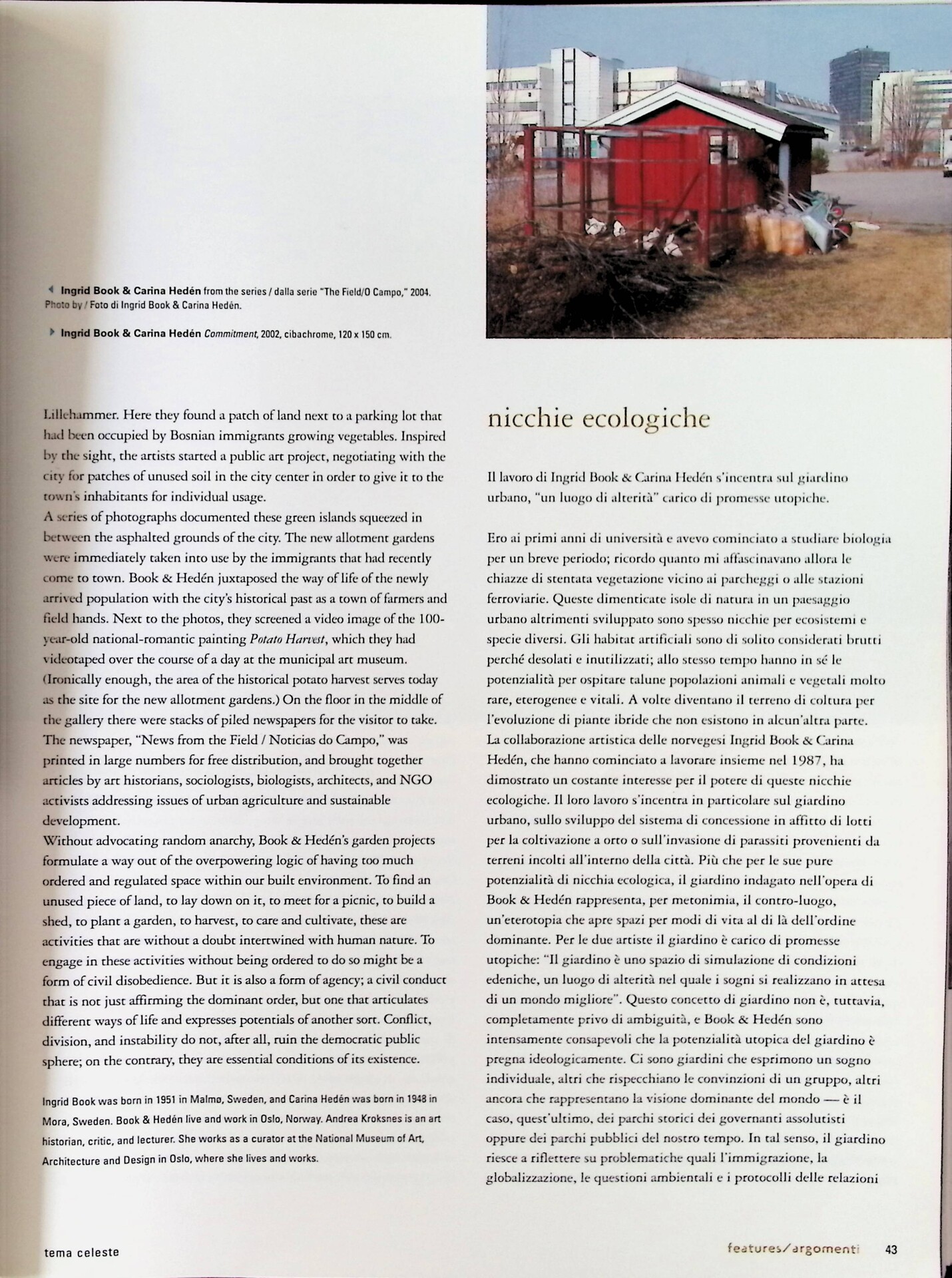| Descrizione | Articolo sul lavoro fotografico del duo Ingrid Book e Carina Hedén, che esplora il giardino urbano come un luogo simbolico di alterità e speranze utopiche. L’articolo analizza il significato dei giardini, trattando temi come l’immigrazione, la globalizzazione, le questioni ambientali e le dinamiche di potere nella società. |