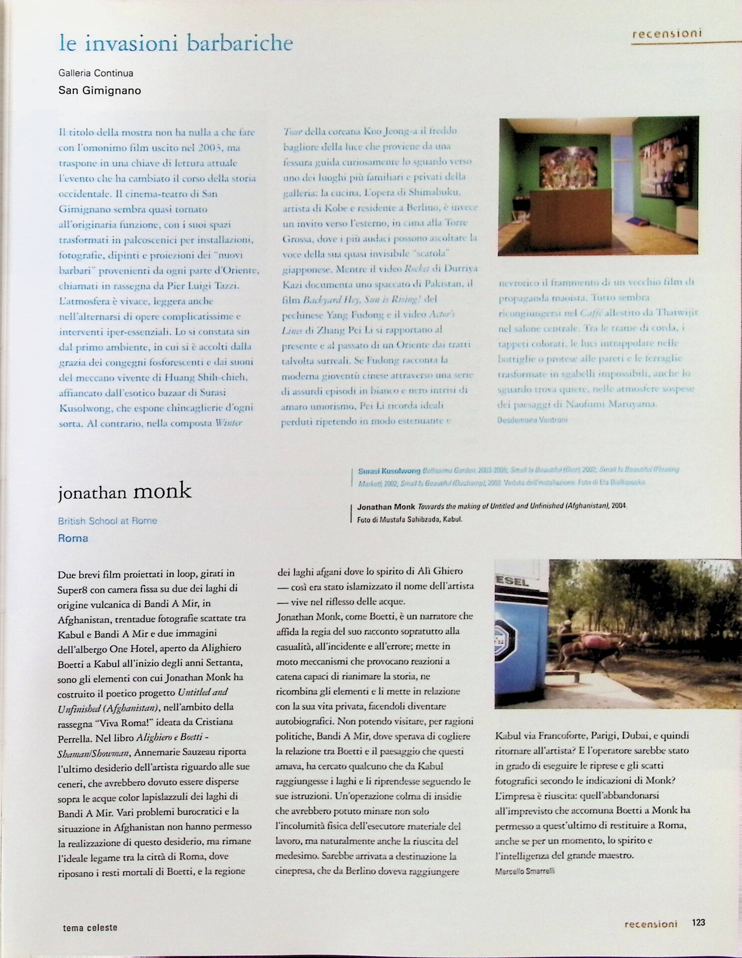 | Descrizione | Recensione della mostra alla Galleria Continua di San Gimignano, con la partecipazione dei cosiddetti "nuovi barbari", artisti provenienti da varie parti dell'Asia. |