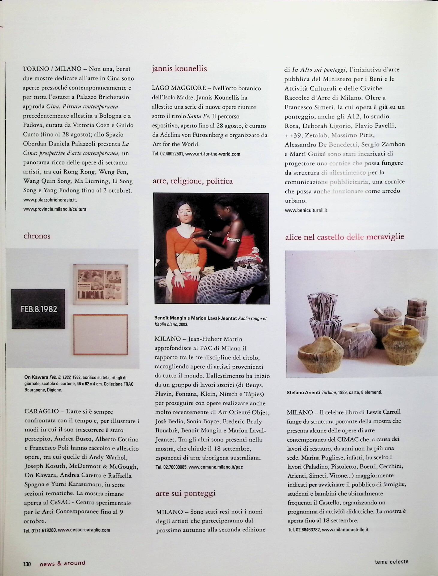 | Descrizione | Segnalazione di due mostre dedicate all'arte cinese contemporanea, una al Palazzo Bricherasio di Torino con il titolo Cina. Pittura contemporanea, l’altra allo Spazio Oberdan di Milano intitolata La Cina. Prospettive d'arte contemporanea, con la partecipazione di artisti cinesi. |