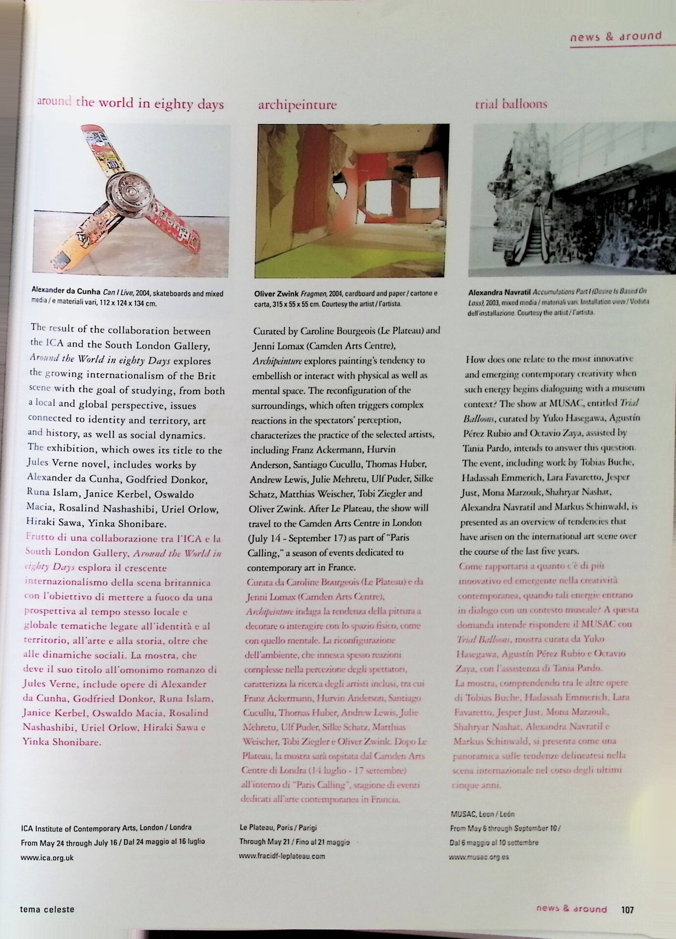 | Descrizione | Segnalazione della mostra Around the World in Eighty Days all'ICA di Londra, che analizza il crescente internazionalismo della scena britannica, focalizzandosi su identità e territorio, con la partecipazione di artisti extraoccidentali. |