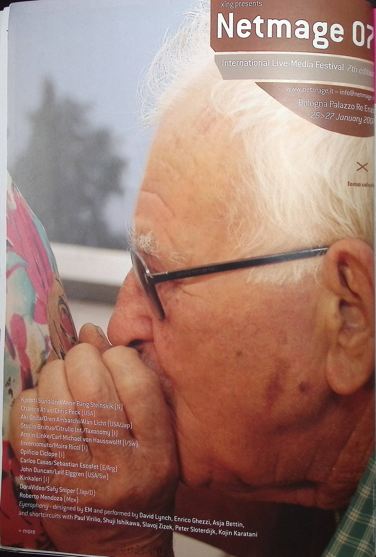 | Descrizione | Pubblicità del festival Netmage 07 International Live-Media Festival al Palazzo Re Enzo di Bologna, con la partecipazione di Aki Onda [giapponese], Sebastian Escofet [argentino] e Roberto Mendoza [messicano]. |