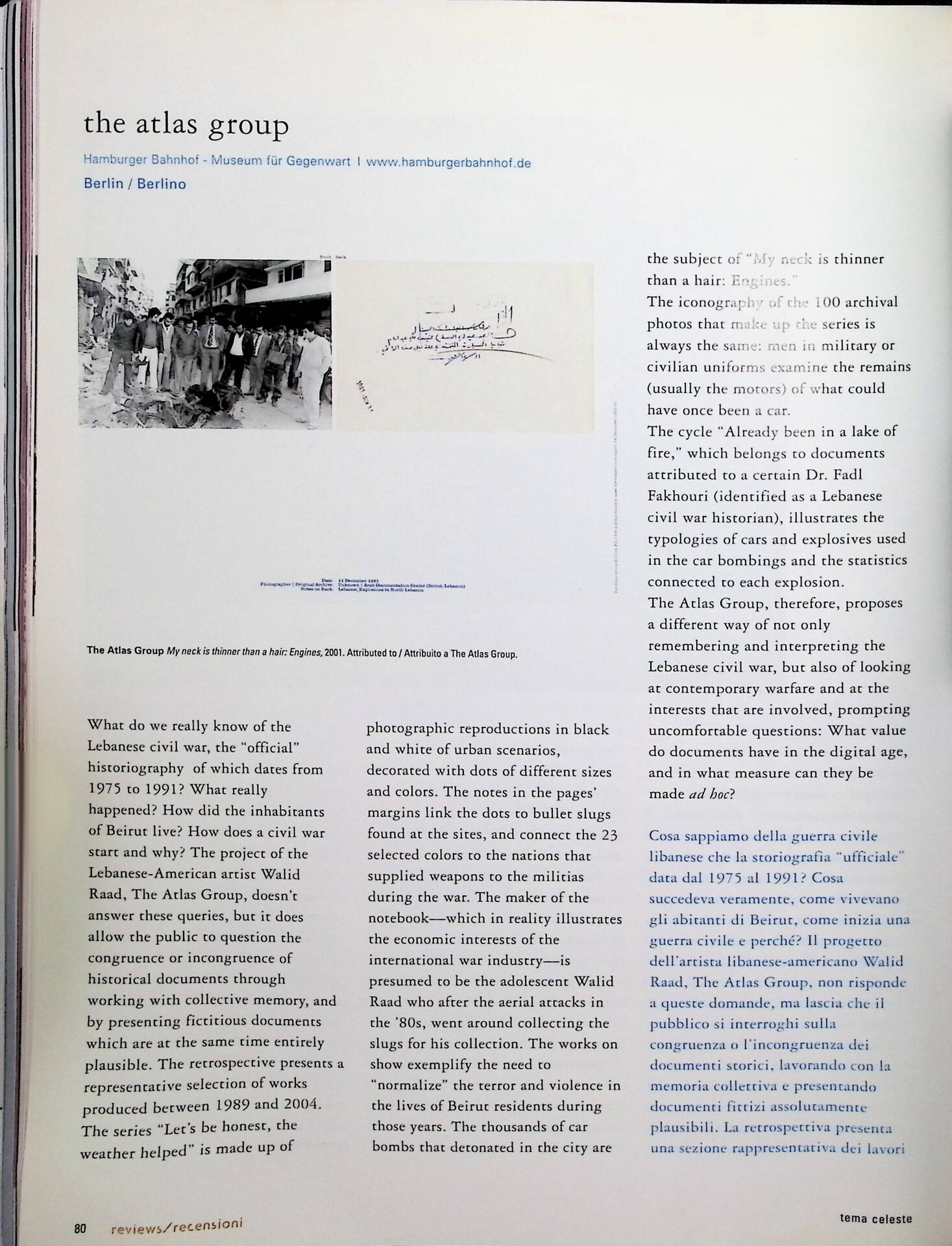 | Descrizione | Recensione della retrospettiva all’Hamburger Bahnhof su The Atlas Group, collettivo creato da Walid Raad [libanese], che lavora sulla memoria collettiva e la storiografia della guerra civile libanese (1975-1991). |