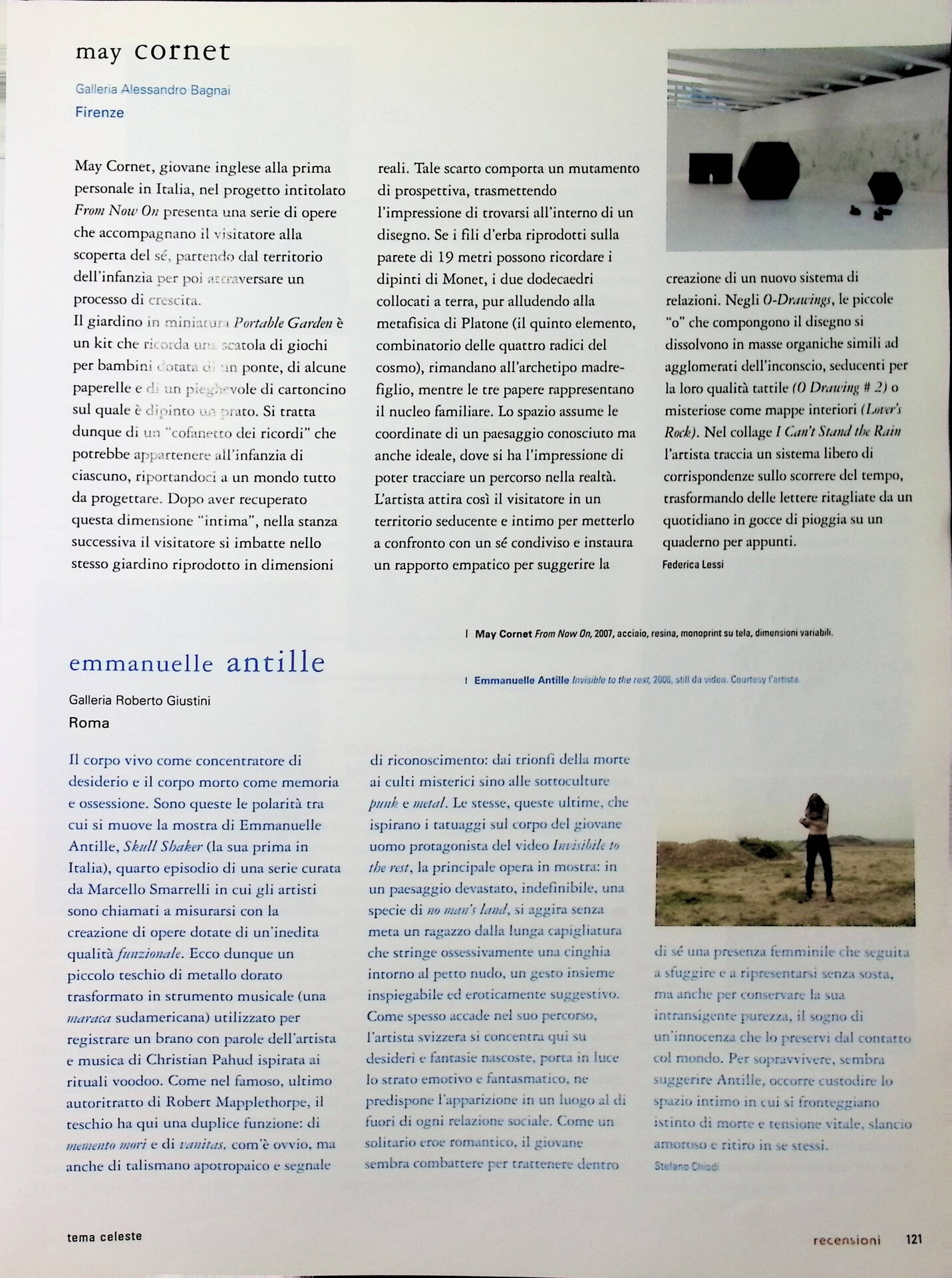 | Cit. bibliografica | Stefano Chiodi, Emmanuelle Antille, «Tema Celeste», n. 121, maggio-giugno 2007, p. 121 |