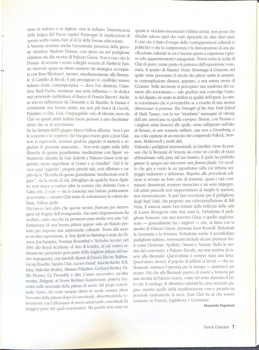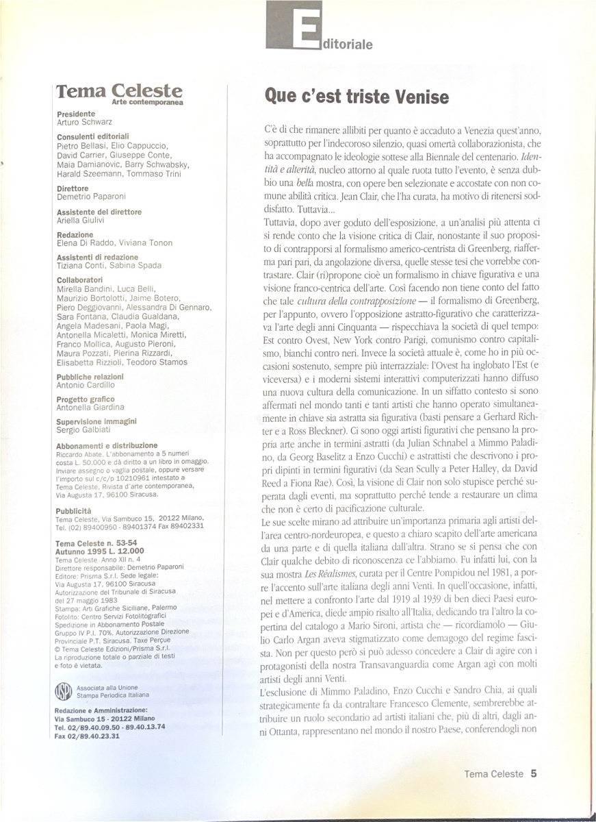 Demetrio Paparoni, Que c'est triste Venise, «Tema Celeste», n. 53/54, autunno 1995, pp. 5-7