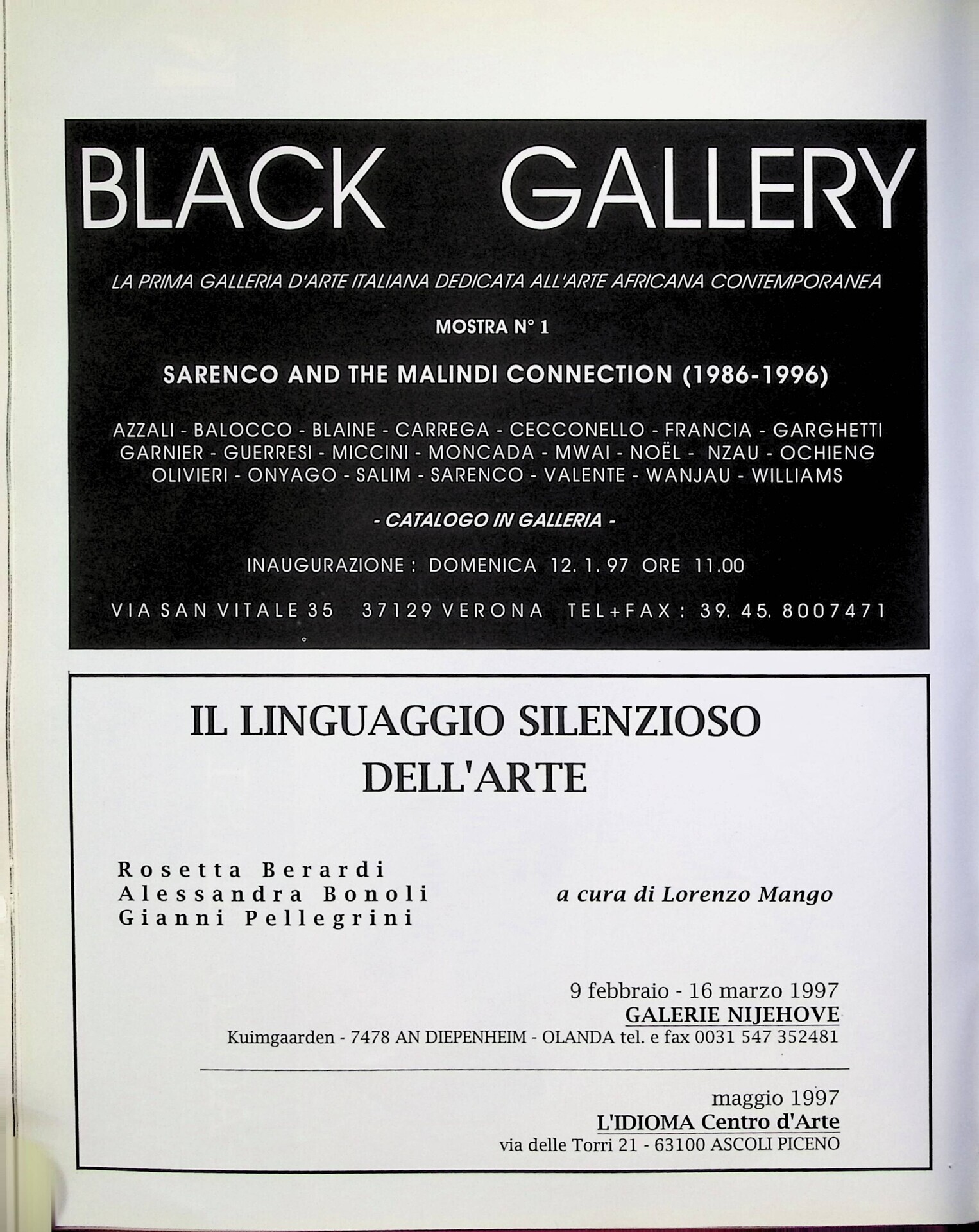 | Descrizione | Pubblicità della mostra Sarenco and the Malindi Connection (1986–1996) alla Black Gallery di Verona, “la prima galleria d’arte italiana dedicata all’arte africana contemporanea”, con la partecipazione di artisti extraoccidentali. |